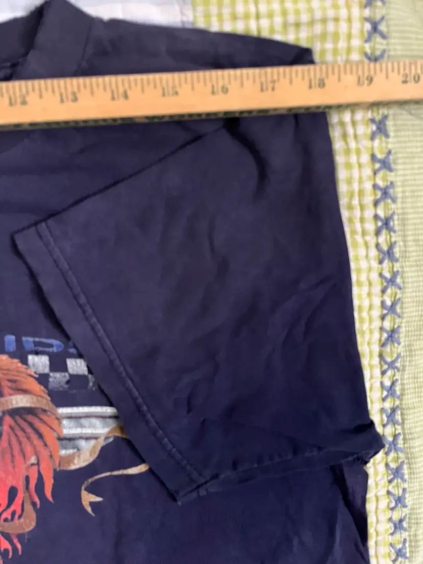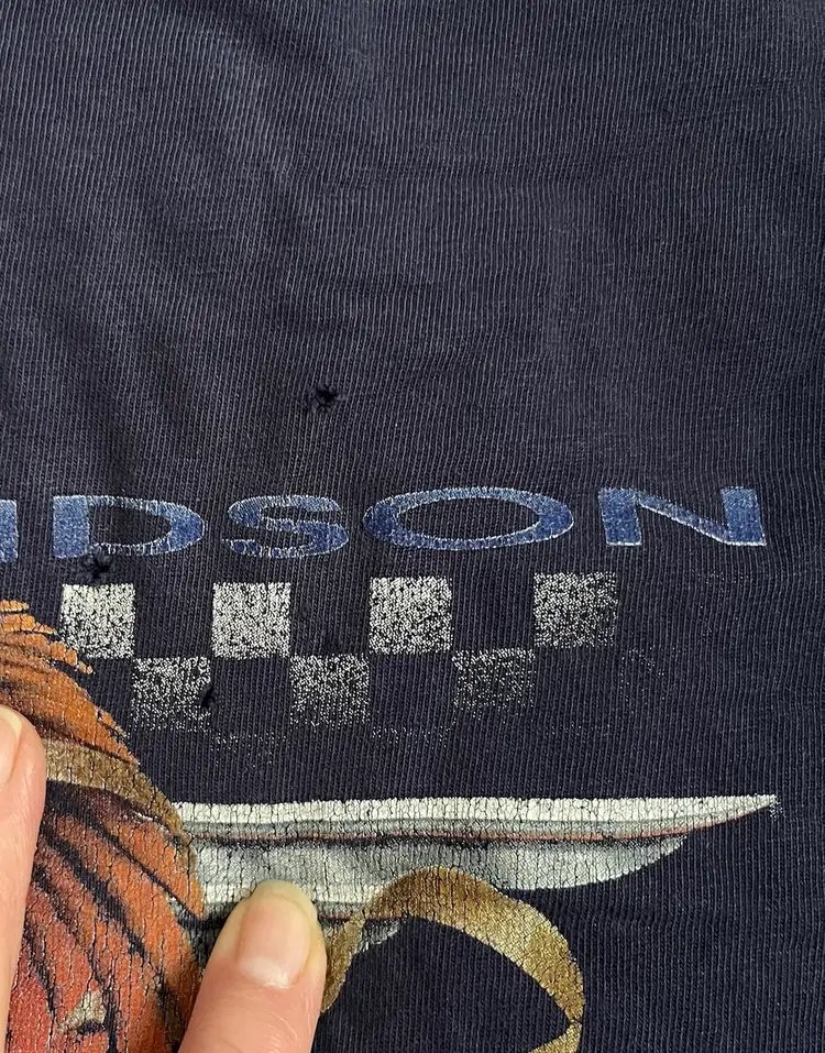 Please look at all the photos prior to deciding to make a purchase. This is a gently used / pre-owned item. And, VINTAGE (20 years +) is seldom perfect. This tee does show authentic wear after many years of use. Now awaiting its next owner. It’s up to the buyer to wash prior to use. It came from storage in a household and will have a stored smell (non-smoking house). Buyer is strongly encouraged to review the photos and decide for themselves its condition as my interpretation may not align with yours. Prior to a purchase, questions not answered in photos, details, description are welcome.
