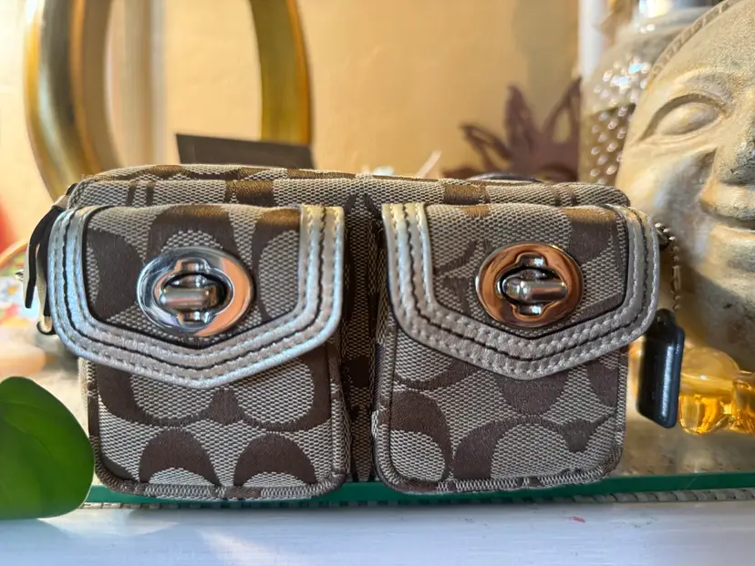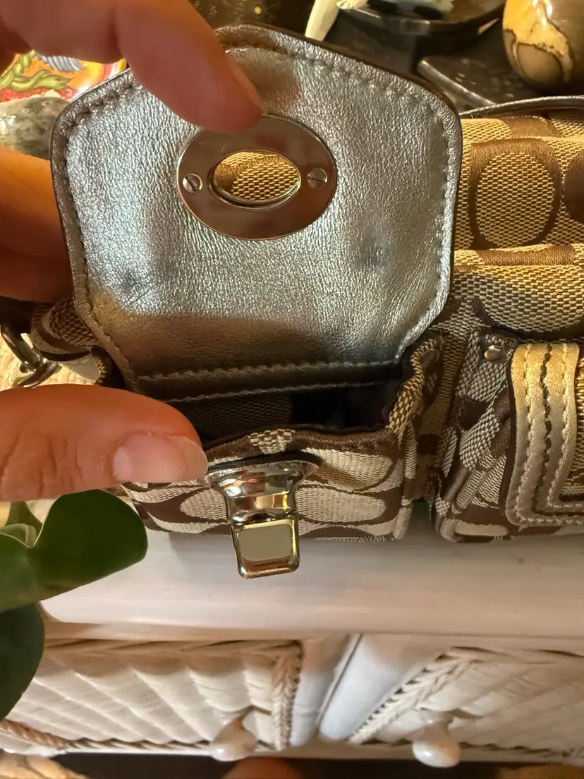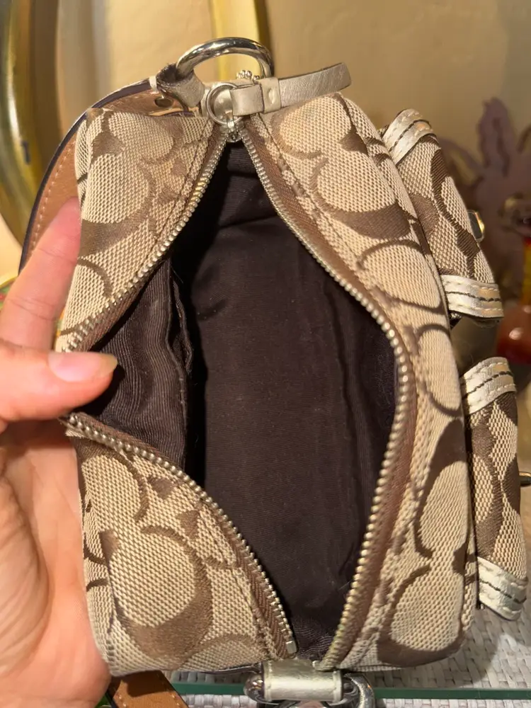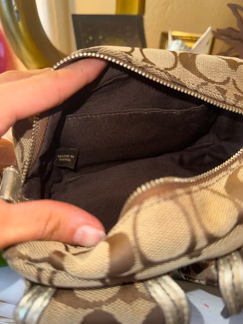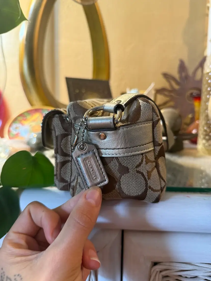 Authentic Coach bag from the mid-2000s specifically the 2006-2007 Legacy/Signature line with OG hang tag! It features a mini hobo / demi shape with short single strap with the classic brown “C” jacquard canvas with metallic leather trim! Double front pockets with silver turn lock closures. No flaws to really note on this lil baby! Interior “Made in China” tag (correct for minis, no creed on this size/year of production) 9” x 5” x 3” 6” strap drop