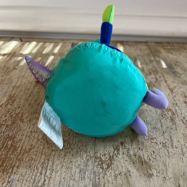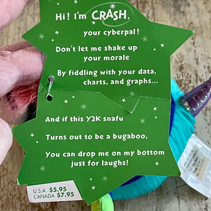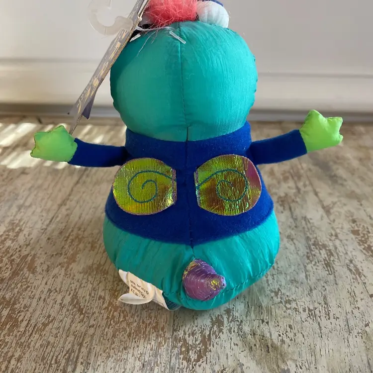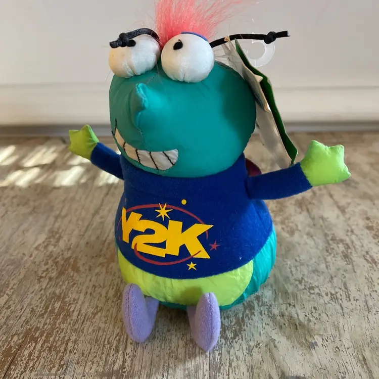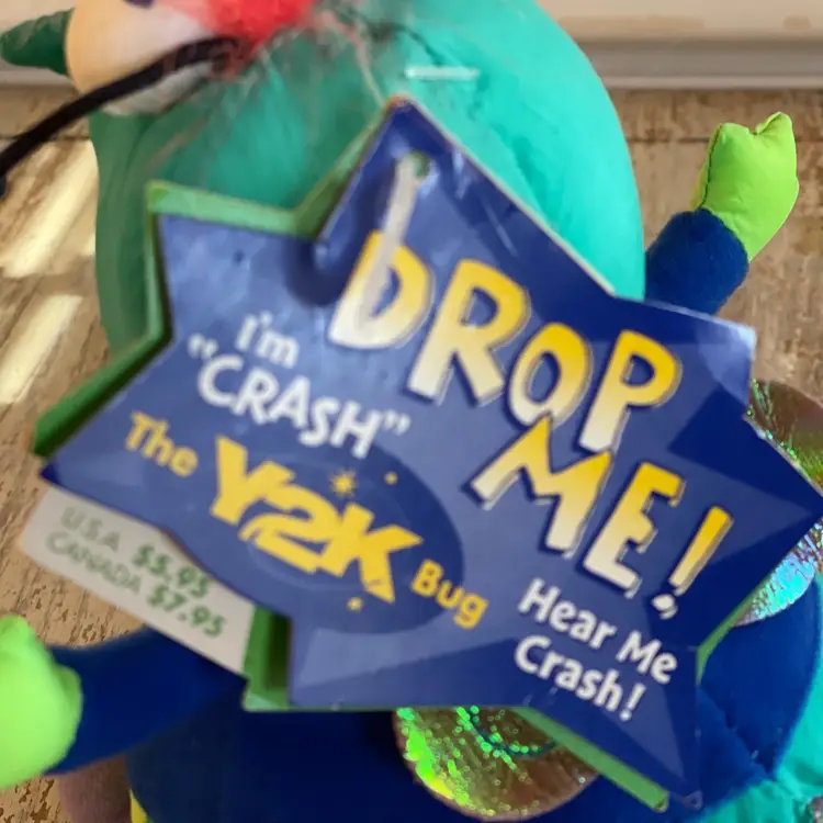 Y2K was the crash that never happened! This little green bug stuffed toy is a NWT Hallmark gag gift to mark the 2000 millennium new year and the big "crash". It has the original tag but the sound no longer works. Cute as a shelf sitter. Some wear from age. Approximately 6 inches tall when seated.