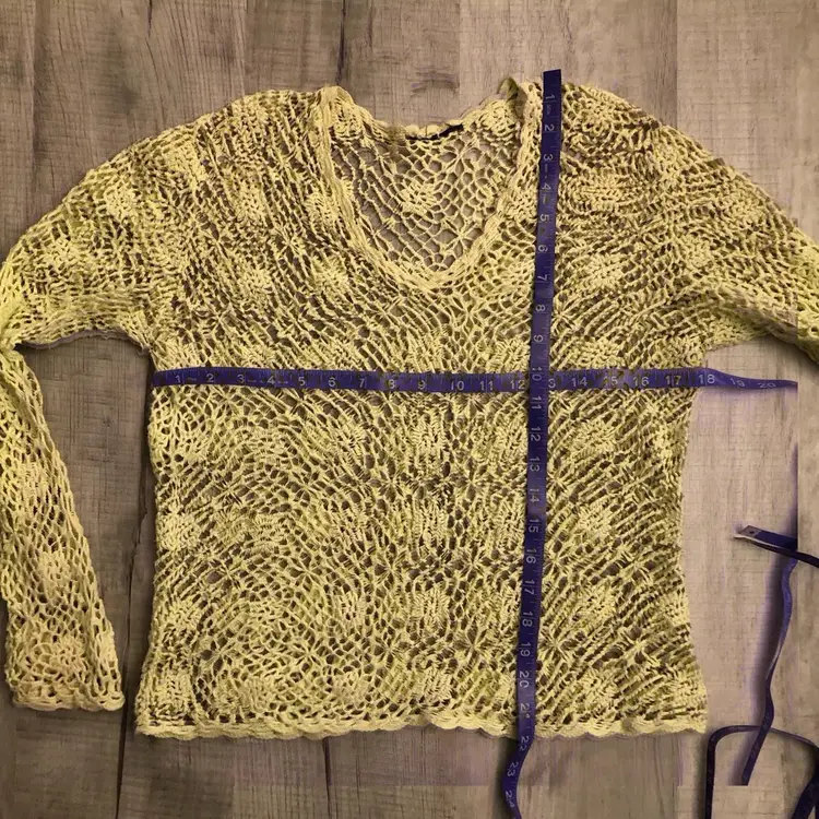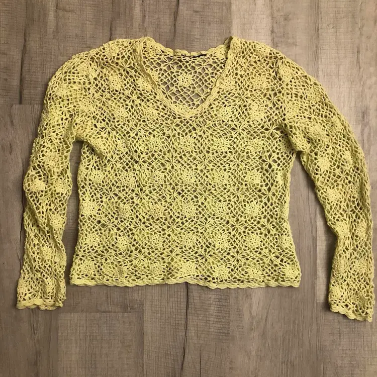 Crochet sheer top, open weave. Color is light yellow green. Bandeau underneath not included