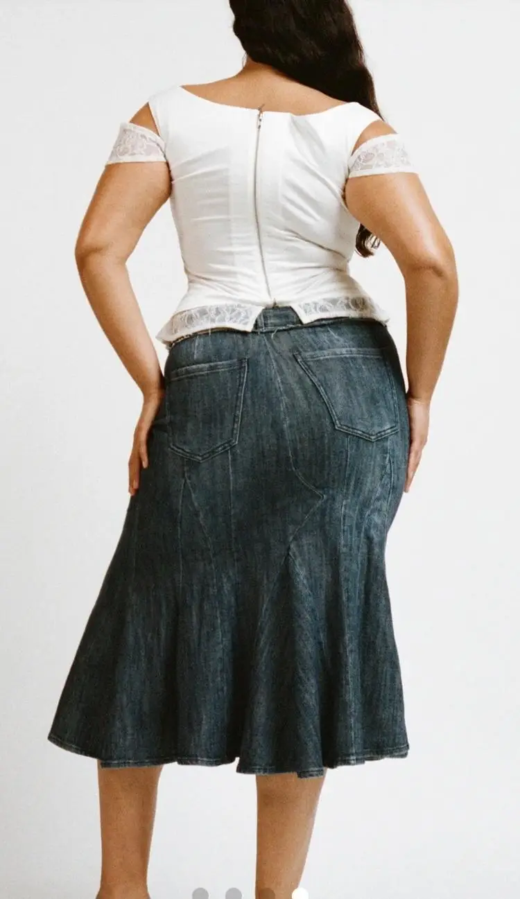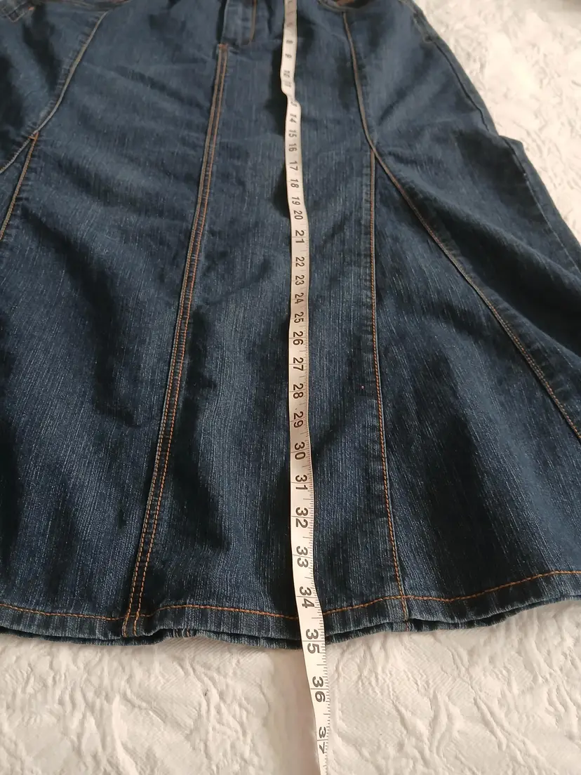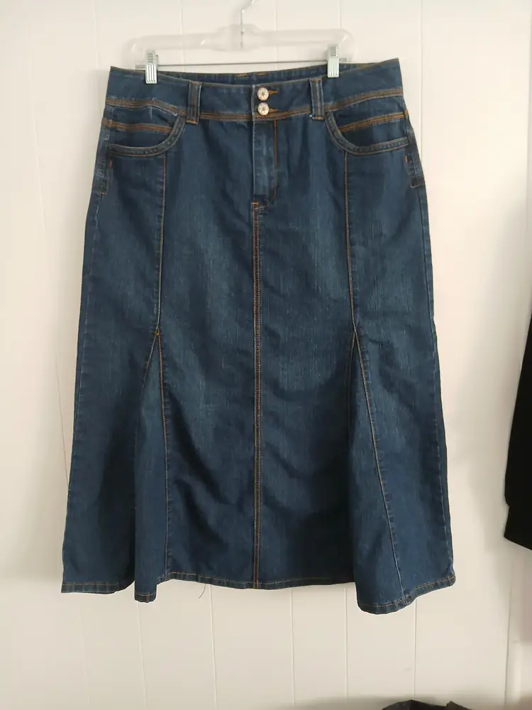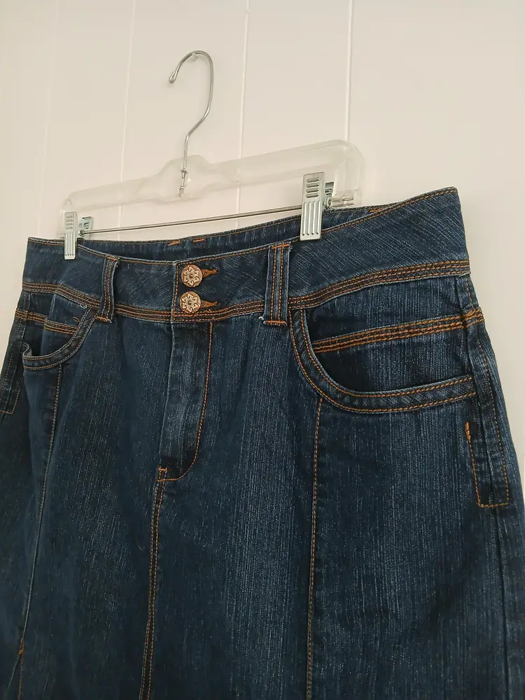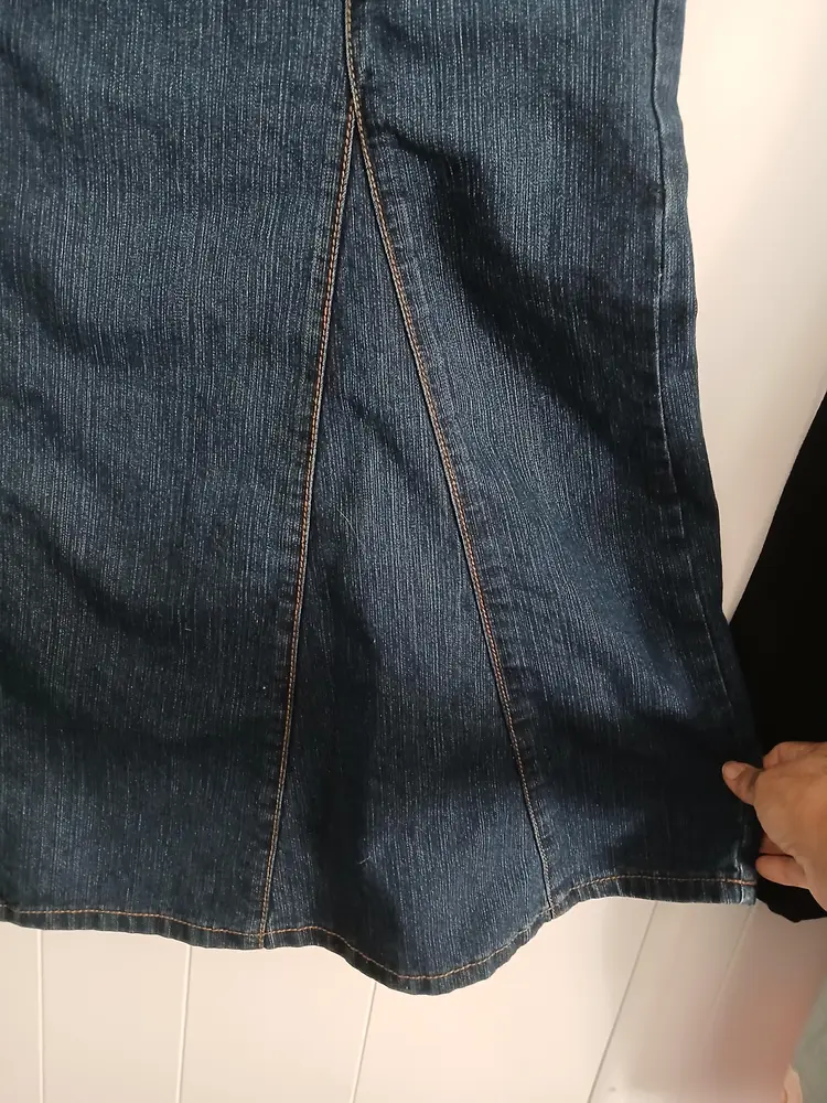 Y2K, VINTAGE DENIM 4 GUSSET MAXI SKIRT, FRONT ZIPPER OPENING ,2 FRONT POCKETS/ 2 BACK POCKETS, GUSSETS 2 FRONT ,1 IN BACK, VERY GOOD CONDITION SIZE 16, MODEL IS FOR FIT PURPOSES ONLY