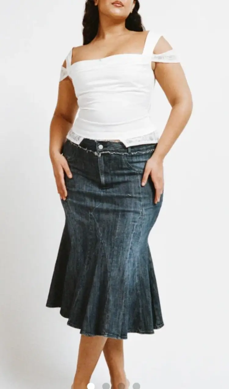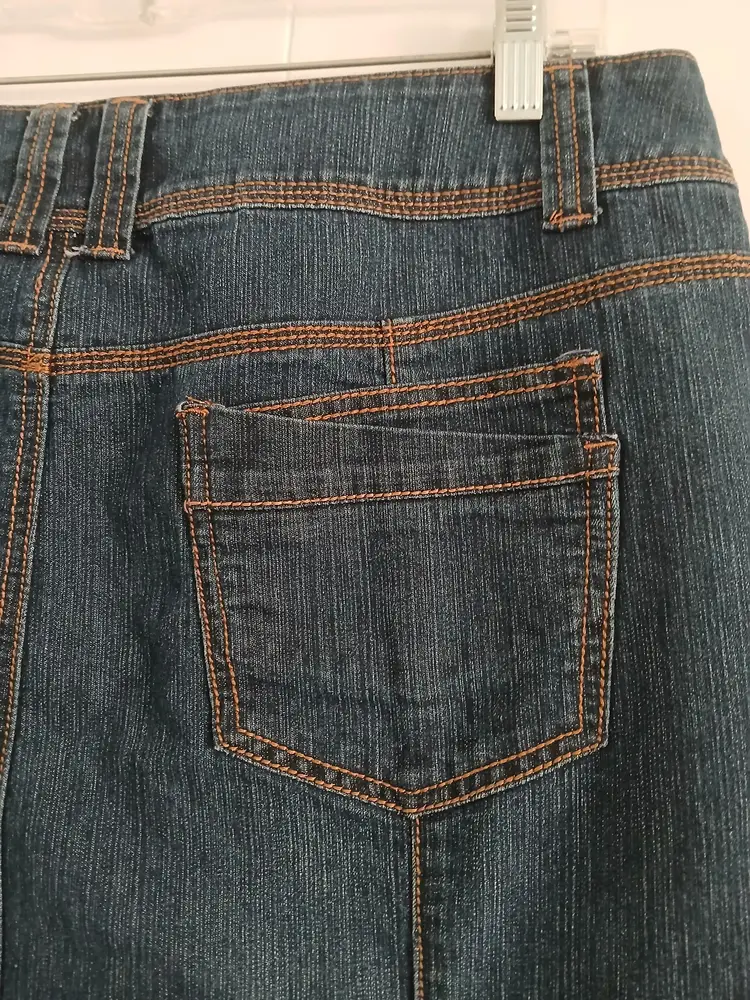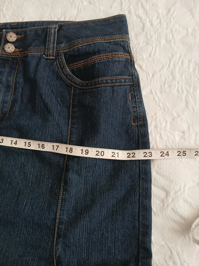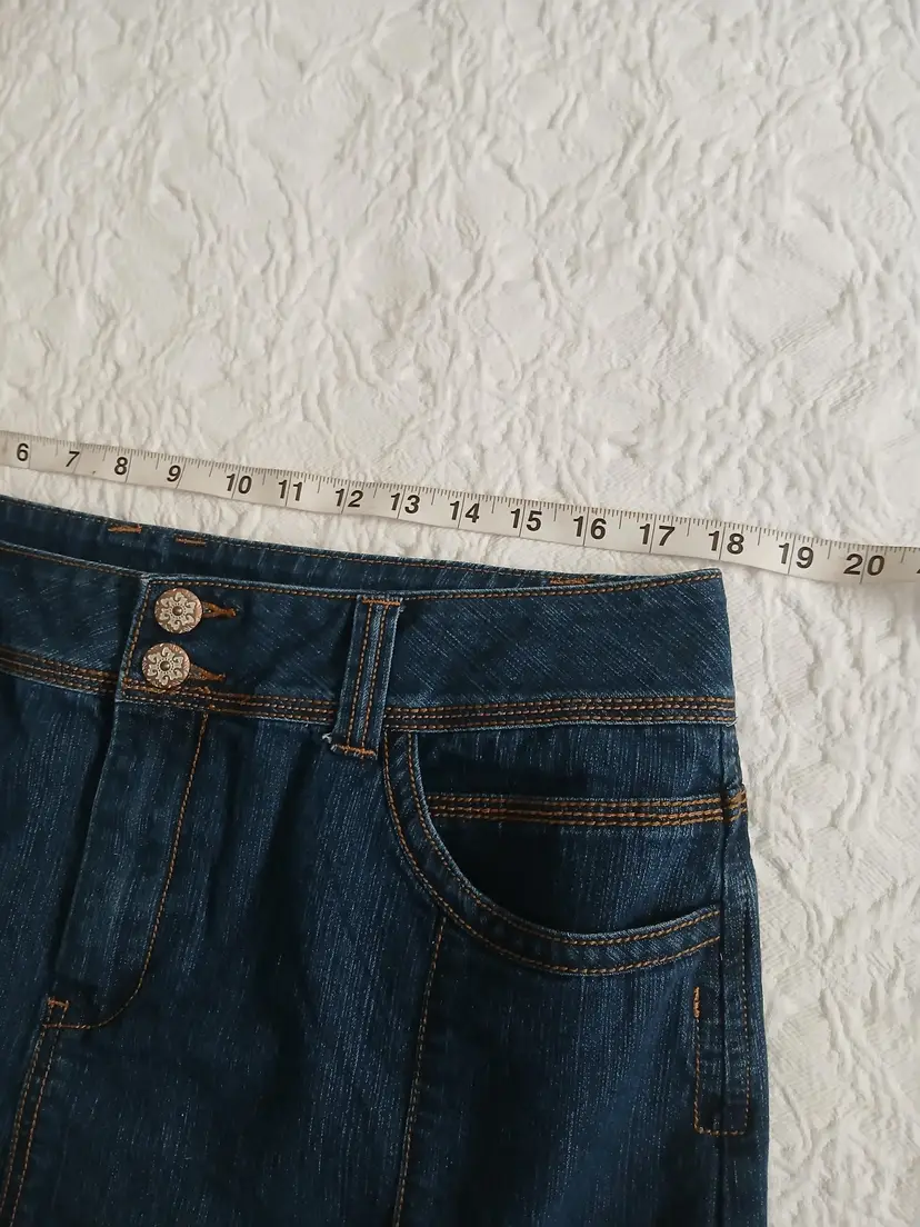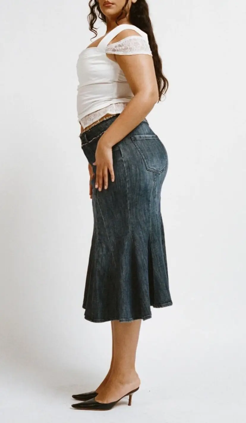 Y2K, VINTAGE DENIM 4 GUSSET MAXI SKIRT, FRONT ZIPPER OPENING ,2 FRONT POCKETS/ 2 BACK POCKETS, GUSSETS 2 FRONT ,1 IN BACK, VERY GOOD CONDITION SIZE 16, MODEL IS FOR FIT PURPOSES ONLY