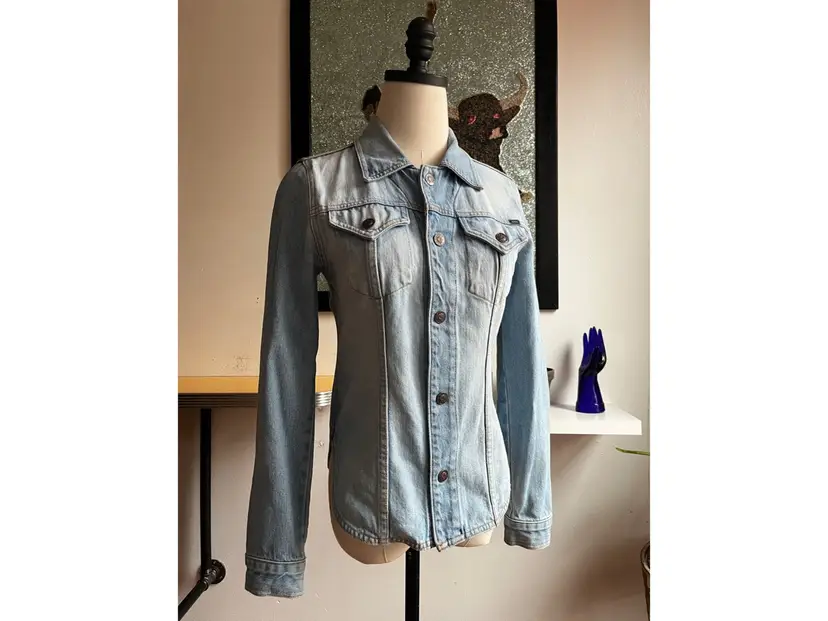 Y2K staple western style denim button down shirt in a blue light wash. Features brown stitching throughout, branded metal buttons, 2 front chest pockets, tailored fit. This is a really quality denim - think very fitted jean jacket. It is marked a medium but does run small, particularly in the chest, so please check the measurements below for accurate fit. USA-made on 100% cotton. Really classic piece! Excellent vintage condition, no flaws. [measurements] Chest: 32 in in Shoulders: 14 in Waist: 30 Sleeve: 24 in Length: 22 in !Please note! when buying vintage that these items are pre-loved! Isn’t that cute? Most vintage items show signs of wear, which is what makes them so special. I do my best to photograph, note anything visible such as stains, rips or holes in the item description. But please be aware that all vintage items will usually show a few signs of wear or slight fading due to age. I hope to find these unique items their forever homes, so if you have any questions about an item or need guidance with sizing, please contact me! I’d love to help! SHIPPING