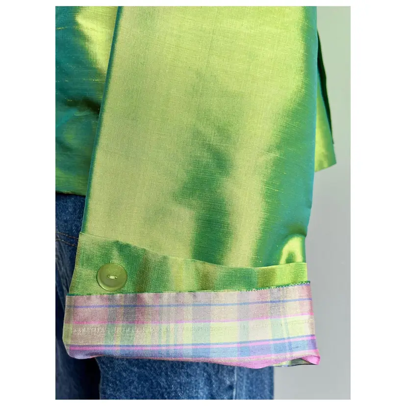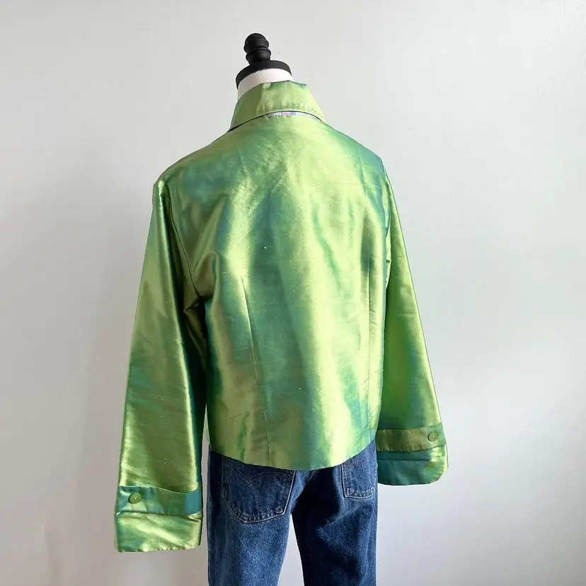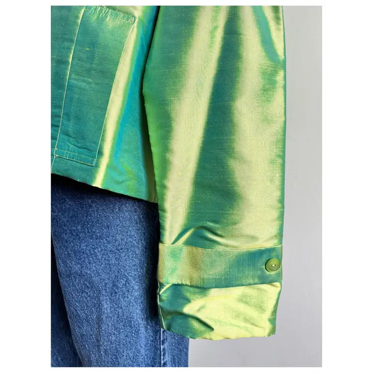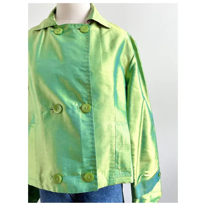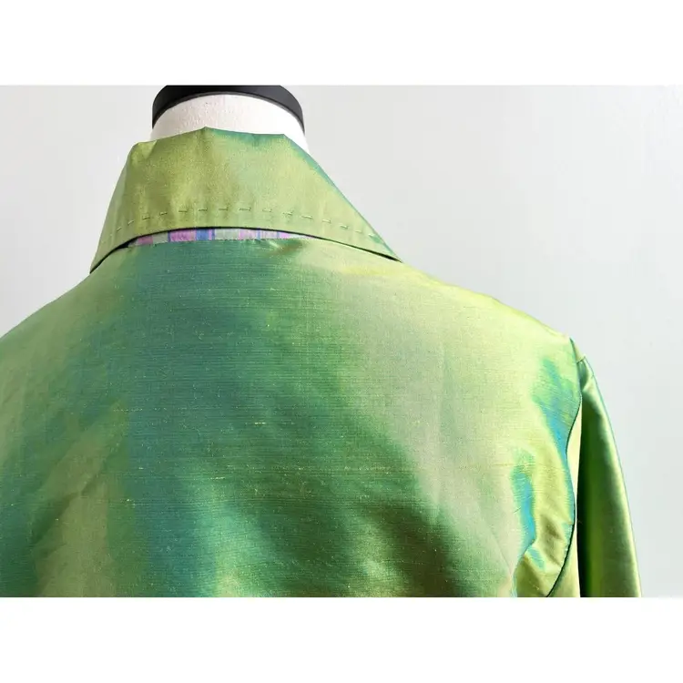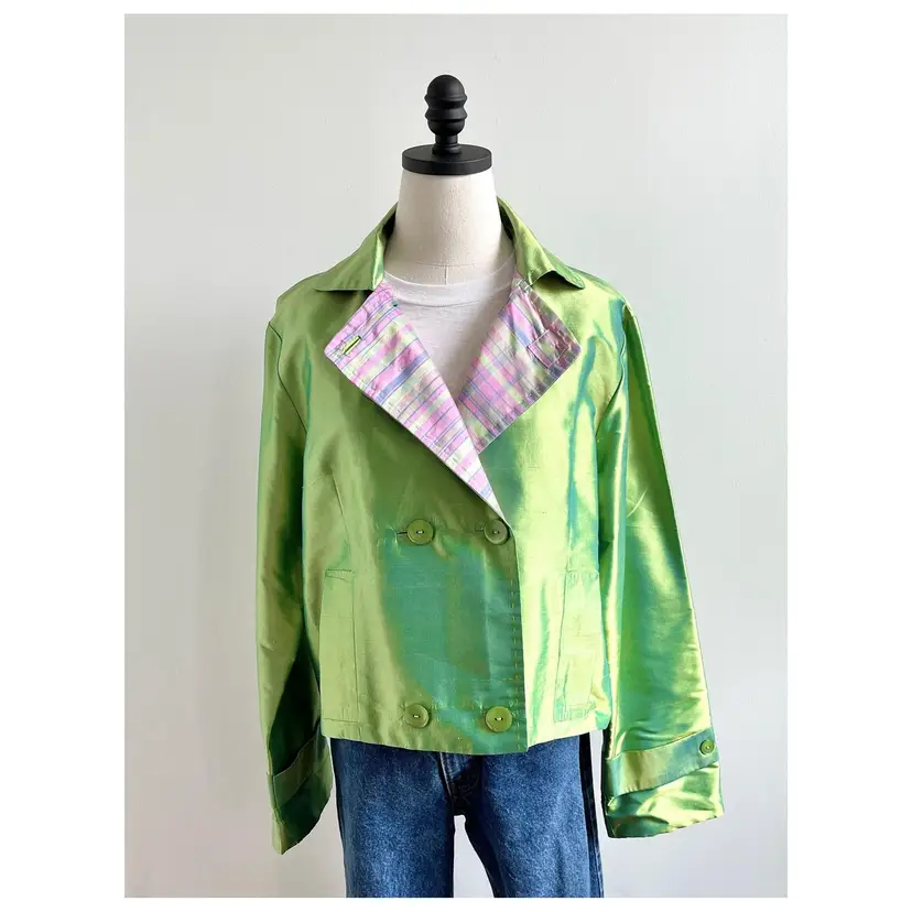 Incredible slime green taffeta trench style jacket circa early 2000s. Gorgeous holographic effect on taffeta and this color just makes it pop - perfect material/tone combo. The boxy cut, extremely 2002. The lining features a plaid print in pink and blue. Double breast collar, 6 buttons, 2 pockets, 100% silk. Deadstock new with tags - no flaws! [measurements] Shoulders: 18 in Chest: 42 in Sleeve: 23 in Length: 21 in YOU DON’T HAVE TO DRY CLEAN THIS PIECE! Instead: ✓ Soak in cool water with ph balanced detergent no longer than 5 minutes ✓ Gently agitate to hand wash ✓ Rinse in cool water 2x ✓ Do not wring ✓ Lay flat to dry ✓ Do not iron - steam to eliminate wrinkles !Please note! when buying vintage that these items are pre-loved! Isn’t that cute? Most vintage items show signs of wear, which is what makes them so special. I do my best to photograph, note anything visible such as stains, rips or holes in the item description. But please be aware that all vintage items will usually show a few signs of wear or slight fading due to age. I hope to find these unique items their forever homes, so if you have any questions about an item or need guidance with sizing, please contact me! I’d love to help! SHIPPING