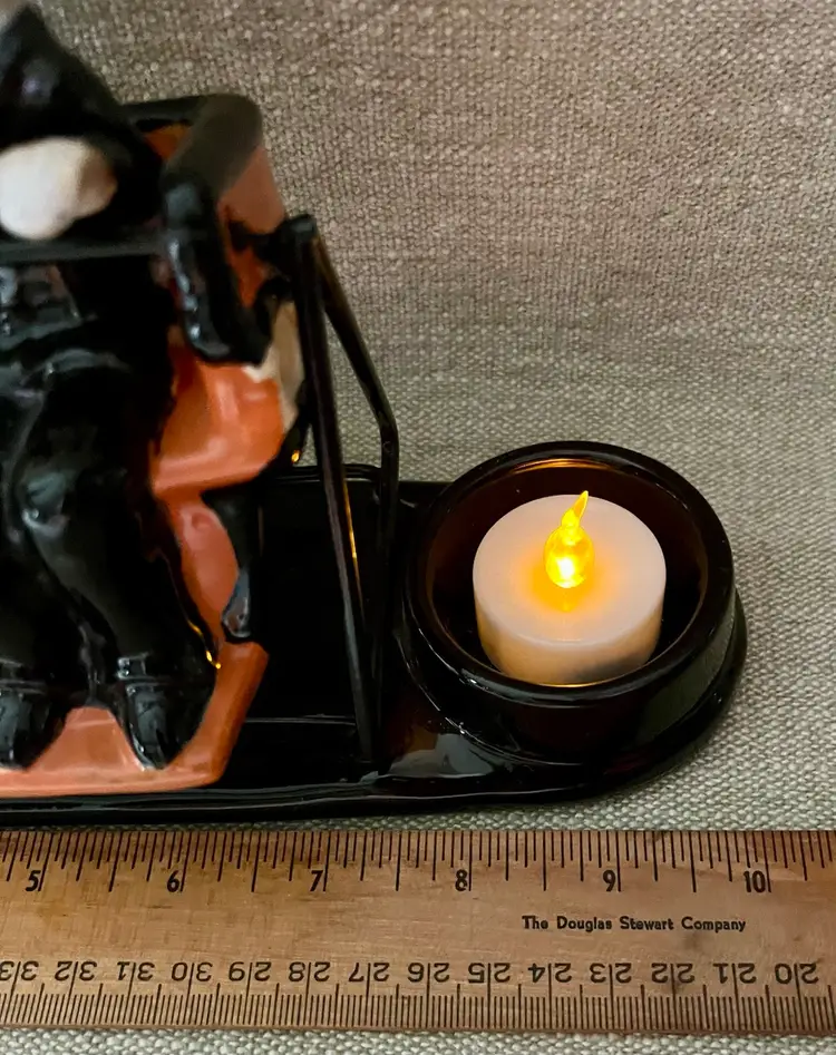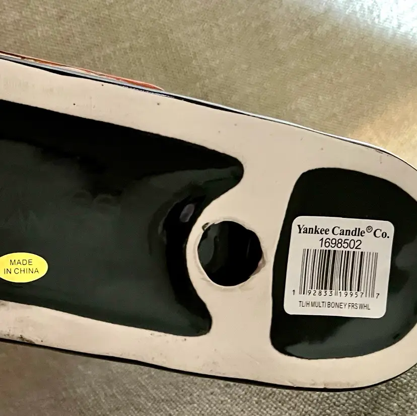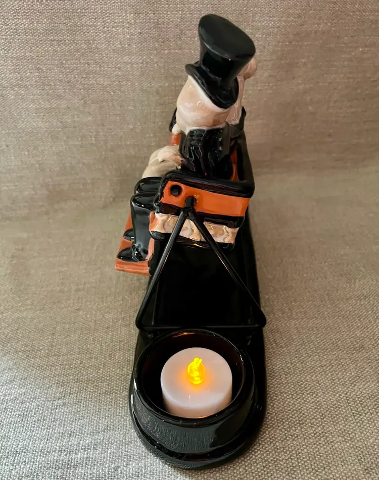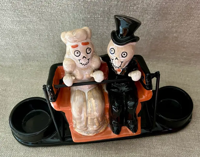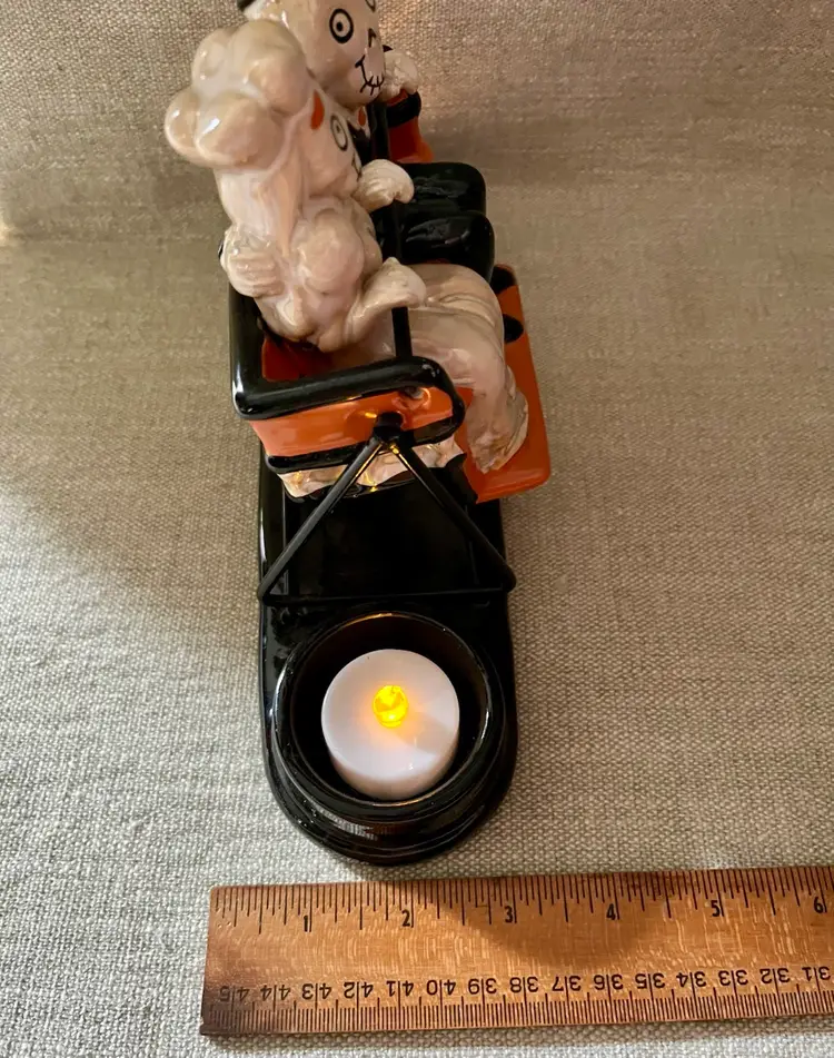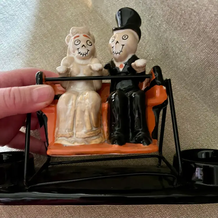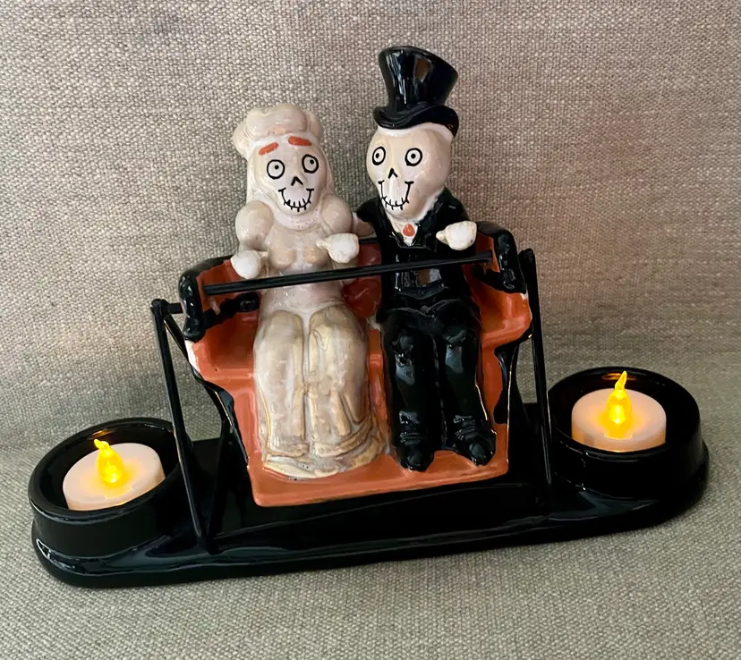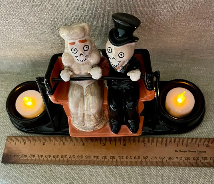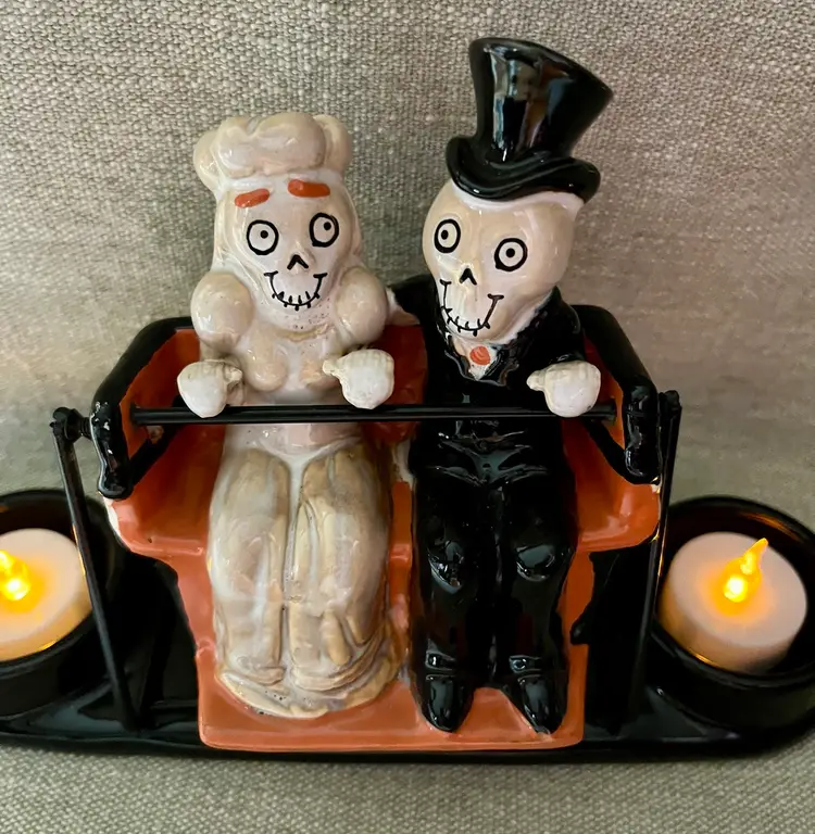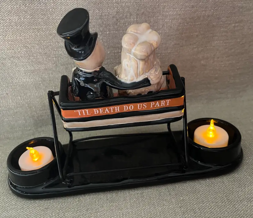 The Yankee Candle Newlyweds Boney Bunch Till Death Do Us Part Ferris Wheel Ride Votive Holder is a unique and whimsical addition to your Halloween decor as they take their first forever boos ride. This ceramic tea light holder features a double tea-light bookended couple, perfect for creating a spooky ambiance. The multicolor design with a Halloween theme and gothic style adds a touch of dark humor to your seasonal celebrations. With a human skeleton wedding couple subject and circus misfortunes theme, this 2021 retired collectible is sure to stand out in your home as a decorative piece. Tea lights do NOT come with this - for display in photography only. Please look at all the photos and short video clip prior to deciding to make a purchase. This is a gently used / pre-owned item with anticipated use, dust, possibly wax and a tiny space of missing glaze from the manufacturer on its metal connector to the ceramic. This piece does have movement on the “bench” as seen in video clip. Buyer is strongly encouraged to review the photos and decide for themselves its condition as my interpretation may not align with yours. Prior to a purchase, questions not answered in photos, details, description are welcome.
