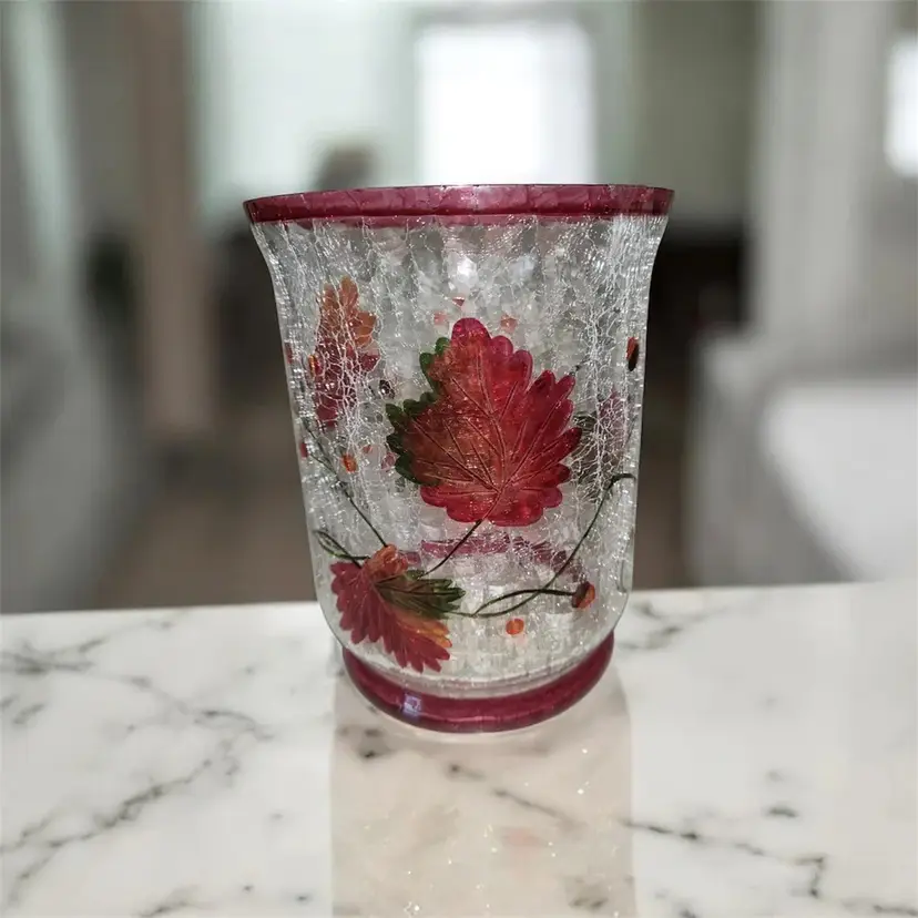 Enhance your fall decor with the Yankee Candle "Fall Leaves" Pillar Candle Holder. Featuring a beautiful cranberry red and other warm hues, this holder is the perfect addition to your autumn festivities. Elevate your space with this elegant and festive piece. Measures approximately 7 1/2 inches tall. Crackle glass