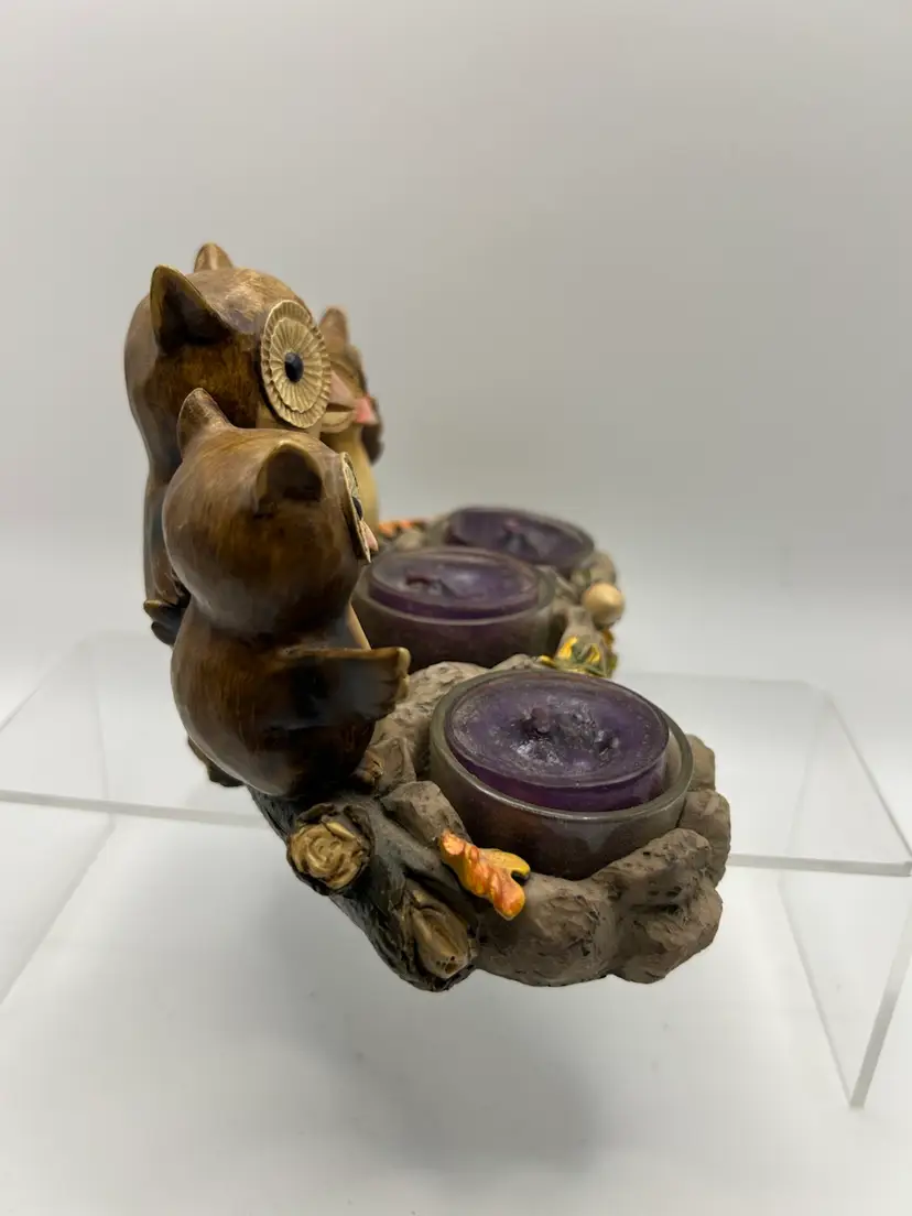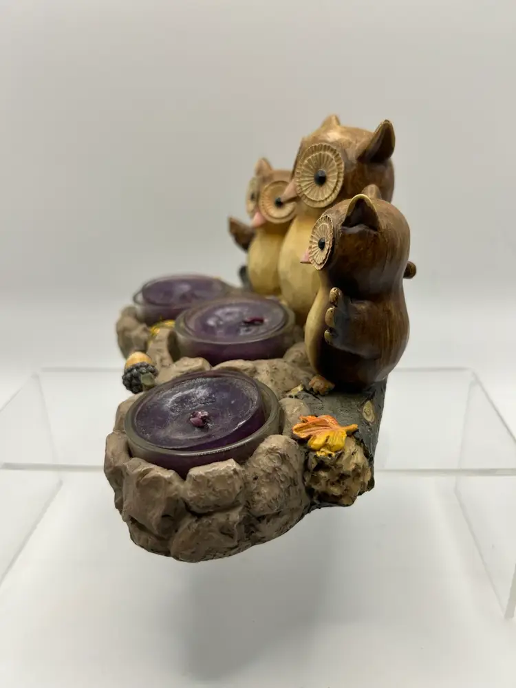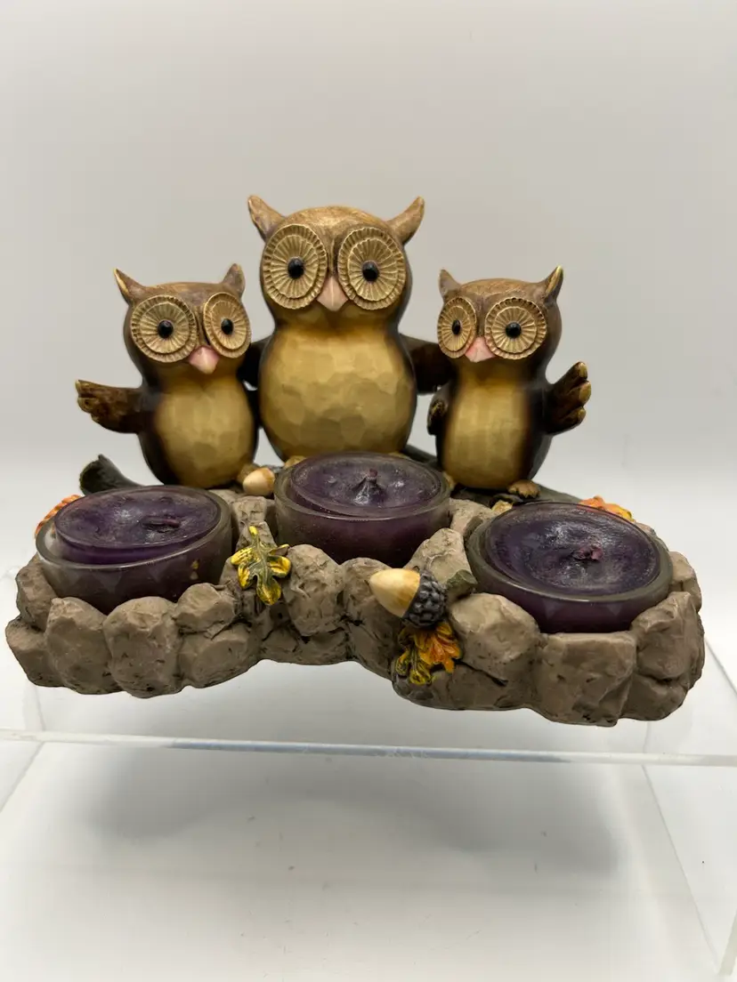 Candle holder features three owls, perfect for fall. It is in mint condition, no breaks at all. It is approximately 4” tall and 6” wide.