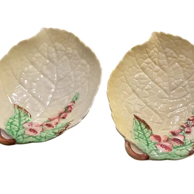 Pretty porcelain trinket dishes 4 1/2 in green leafs and flowers crazing one. Made by Carlton Ware
