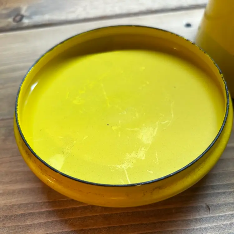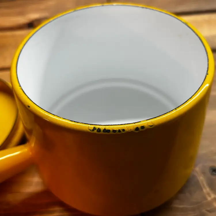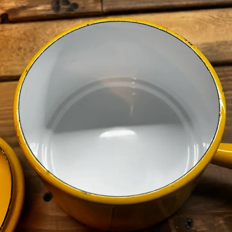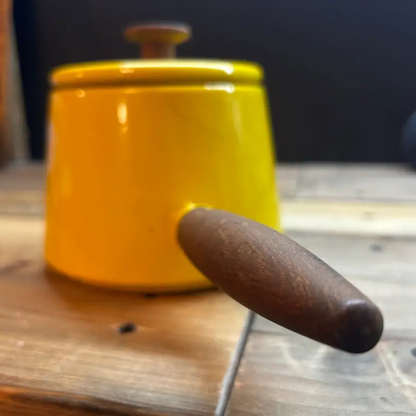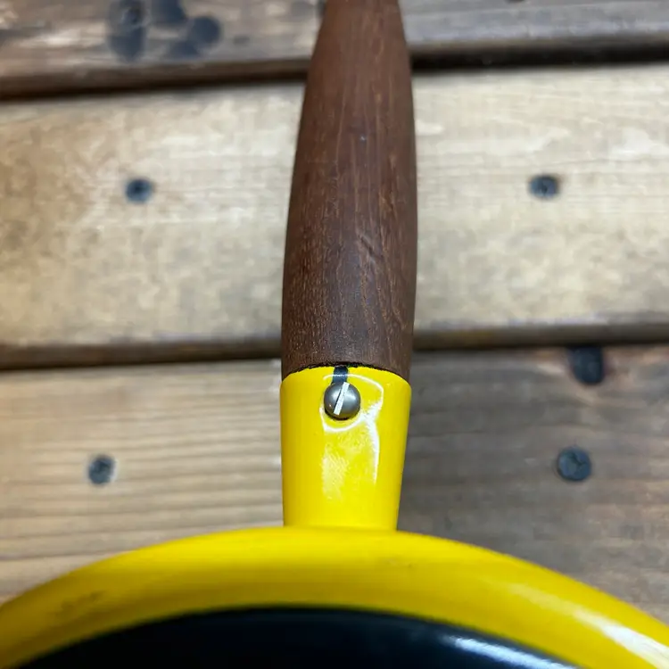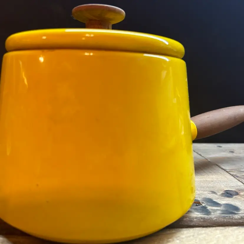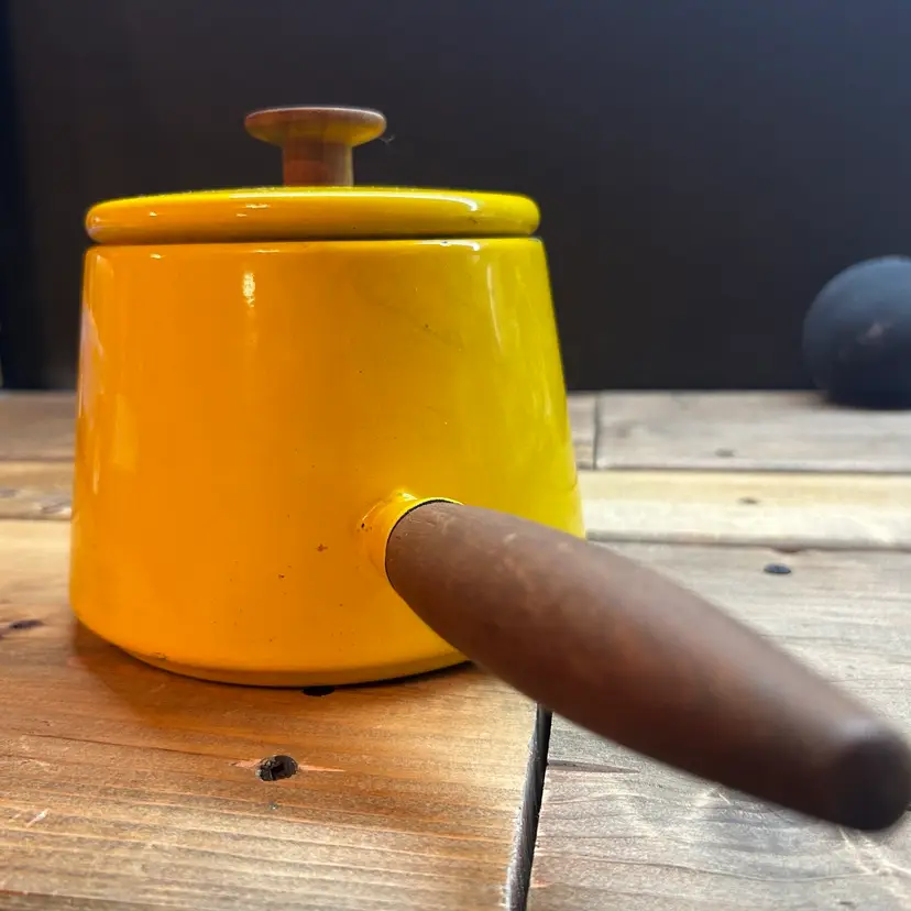 This vintage Copco fondue pot is a cheerful addition to any kitchen or dining room. The bright yellow enamel finish adds a pop of color to your decor, while the electric or gas stove compatibility ensures that it will work seamlessly with your cooking setup. Made in Denmark, this original piece is a must-have for any collector of vintage cookware. Michael Lax Design Cottage is the perfect addition to your collection.