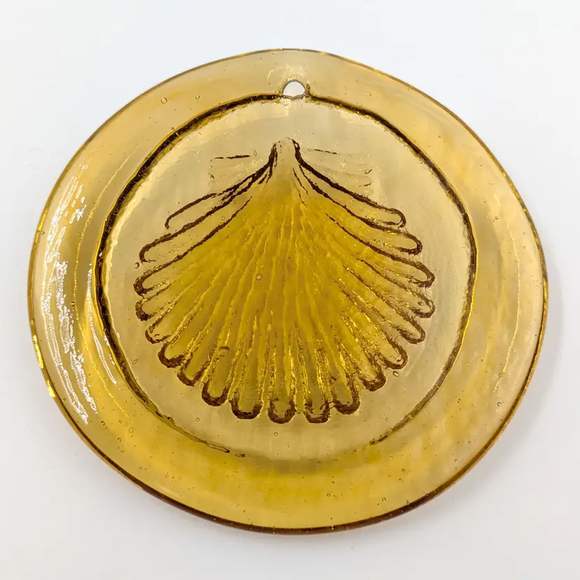 Yellow glass suncatcher or ornament features a detailed scallop seashell design, adding a coastal touch to any space. Ideal for nautical-themed decor. Surface scratches and minor imperfections. Minor wear as seen in photos.