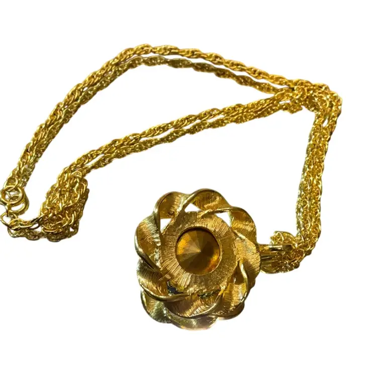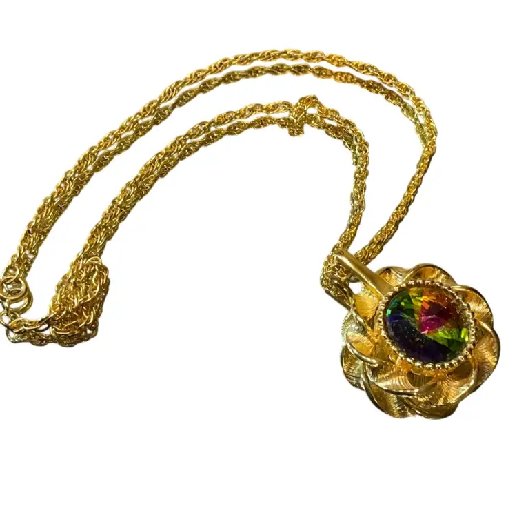 VTG pendant necklace with a stunning rhinestone on which reflects and shows its beautiful colors in natural light. Chain measures 9” and pendant 1.5”.