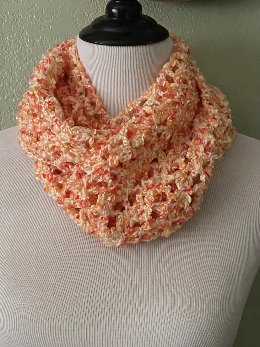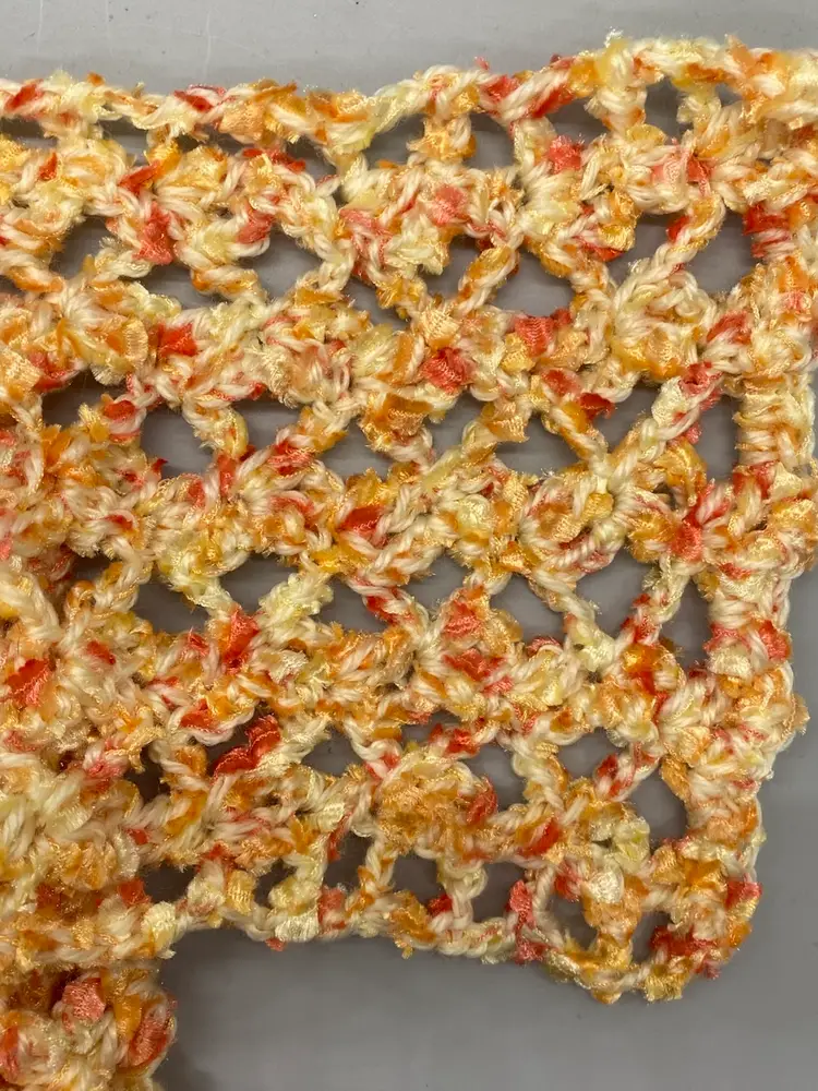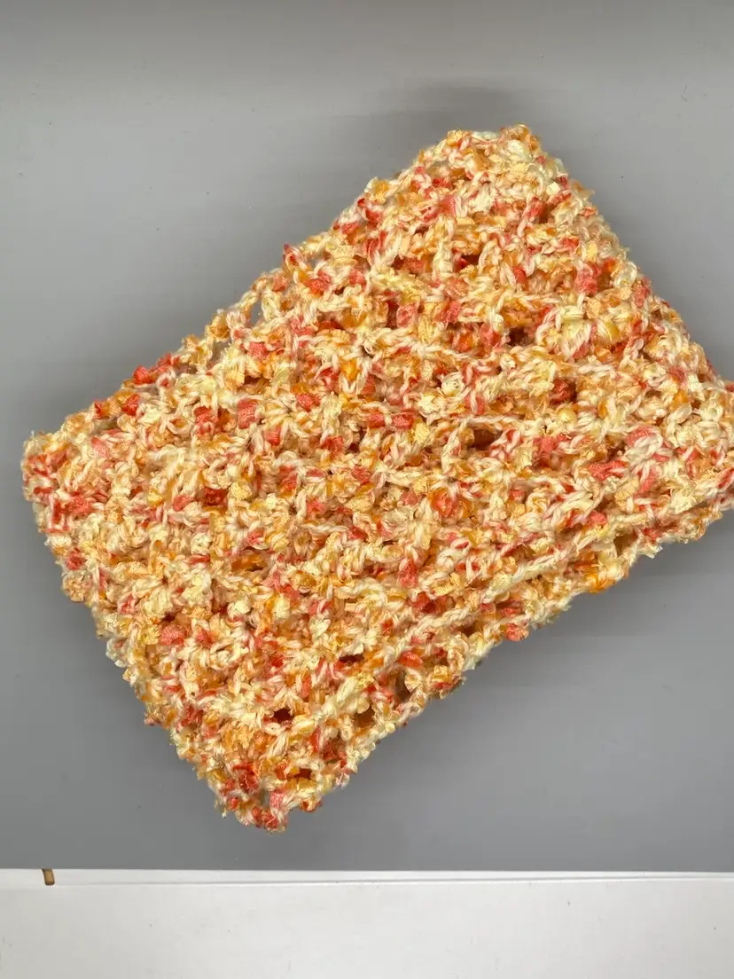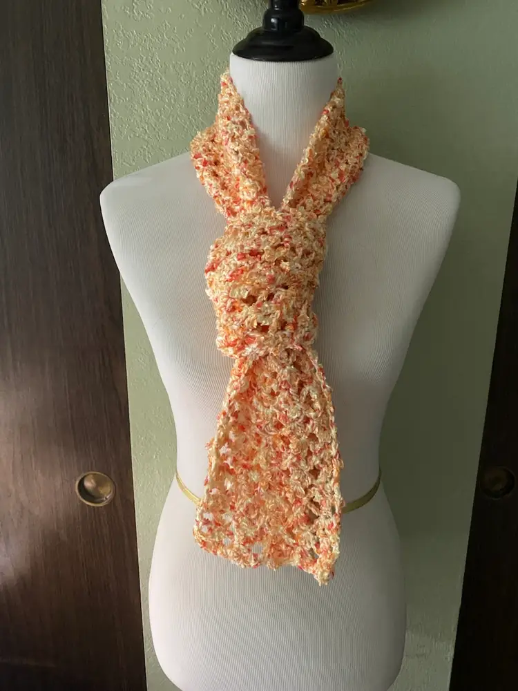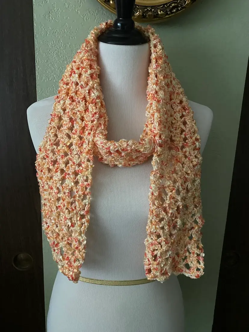 Wrap this beautiful lace crochet long scarf around your neck. Lightweight enough to wear on cool spring days or in fall and winter 2 plys of yarn pastel yellow baby yarn orange & yellow novelty yarn soft and cozy lace pattern measures approx 5" wide x 65" long hand wash, dry flat.