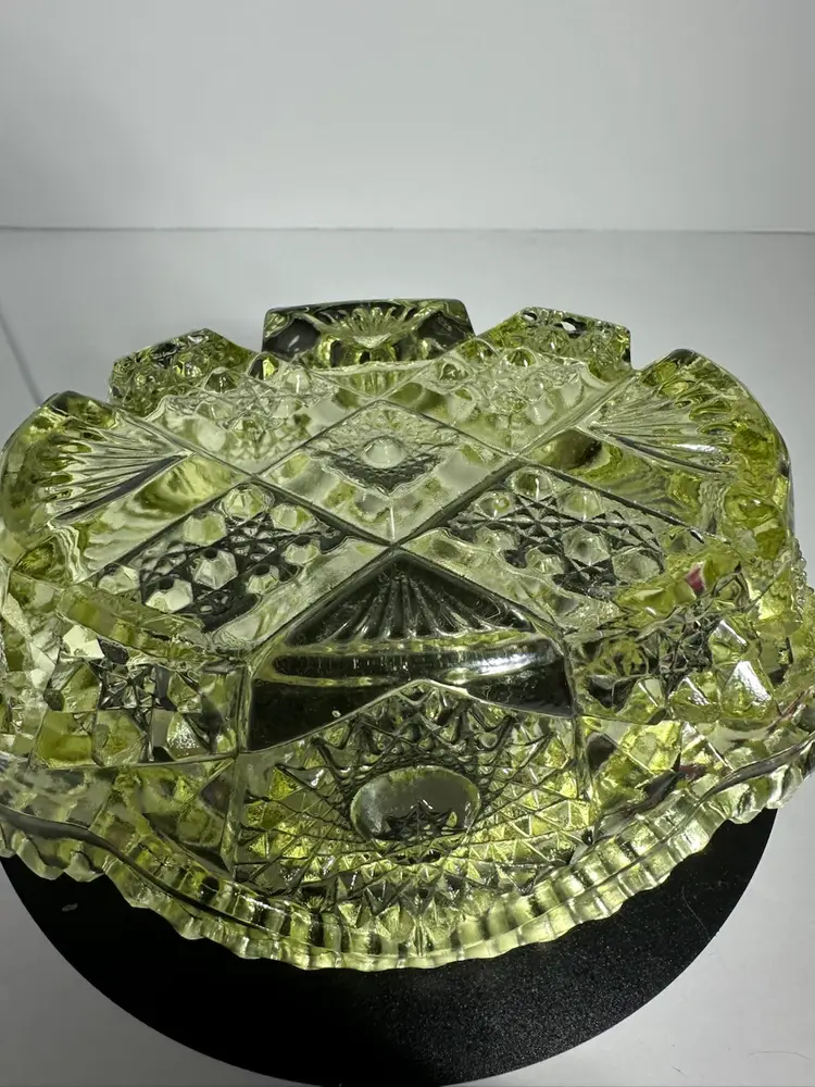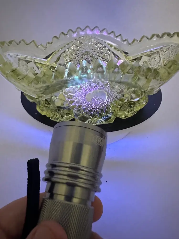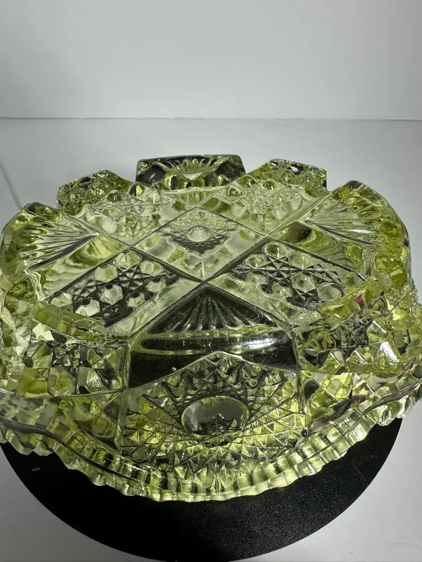 There are couple of flea bites on the saw tooth edge more feel them than can see them. This is yellow glass but does not glow. Measures 6.5 x 4.