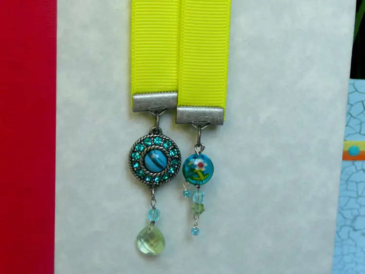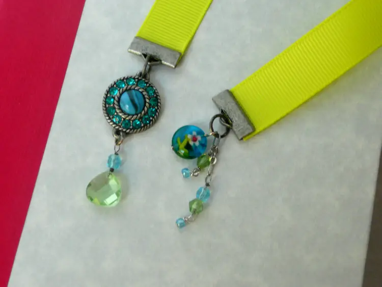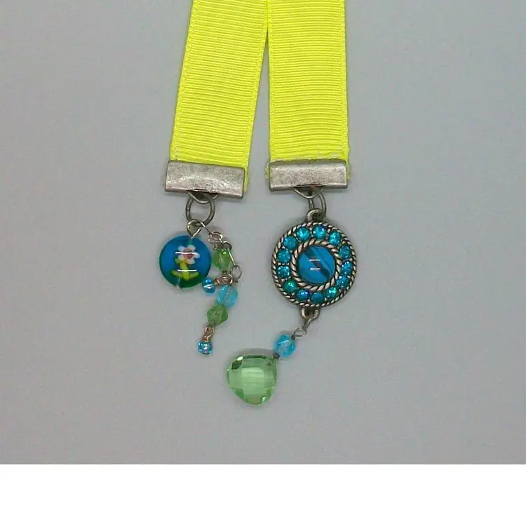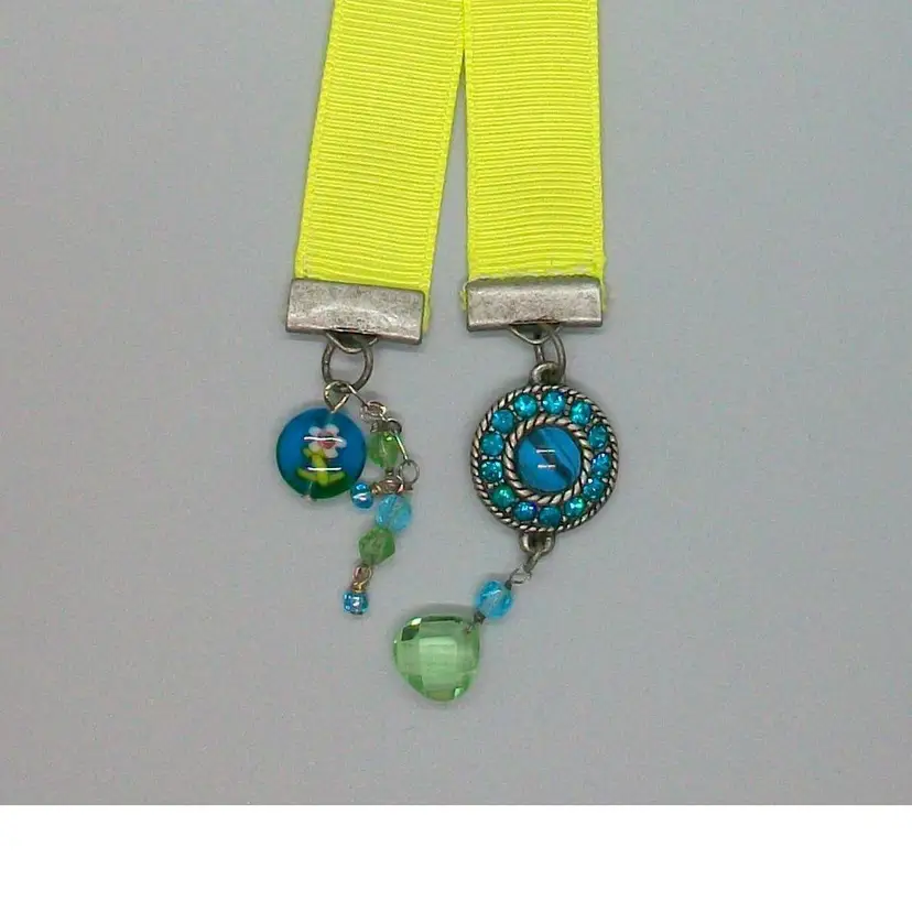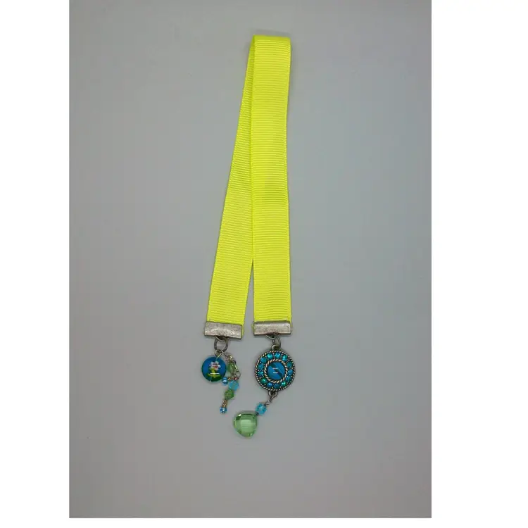Brighten up your reading time with this handmade neon yellow ribbon bookmark. It features unique beaded charms, from repurposed broken jewelry, adding a touch of whimsy to your favorite book. Perfect for book lovers and a great gift idea! Ribbon measures 10.25" long