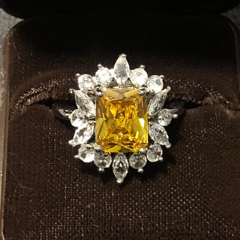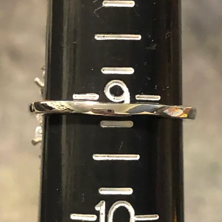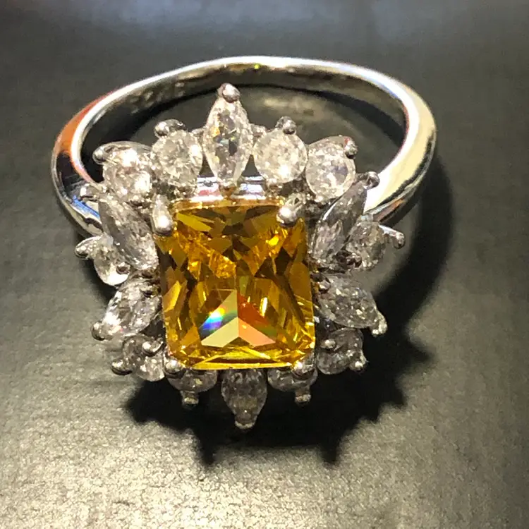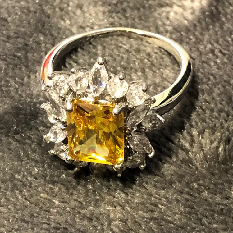 Unmarked on the inside Really stunning ring Does not come with the jewelry box or sizer