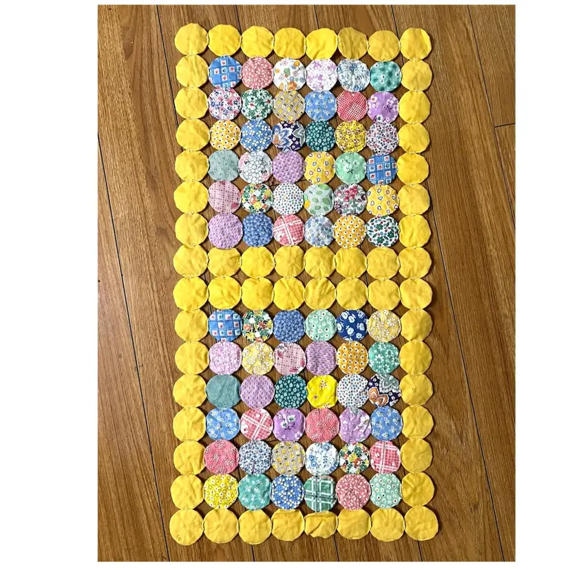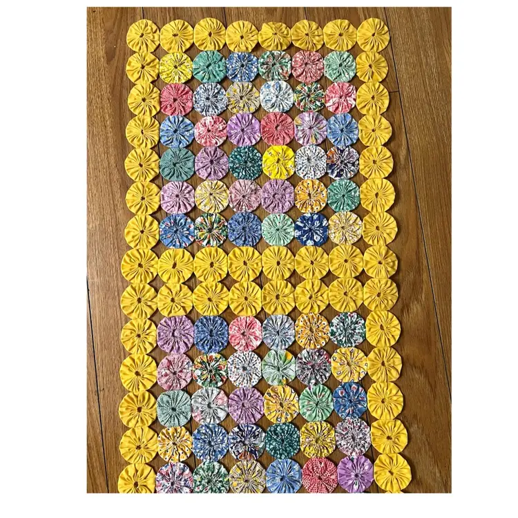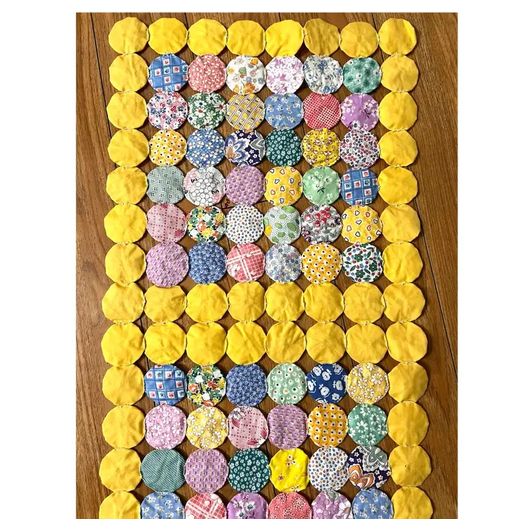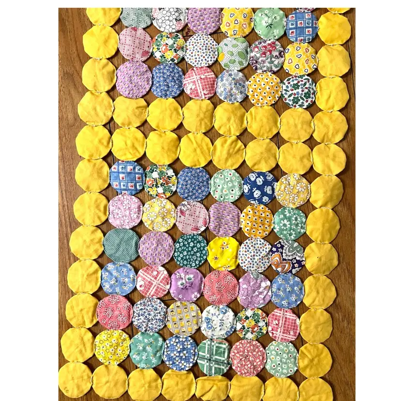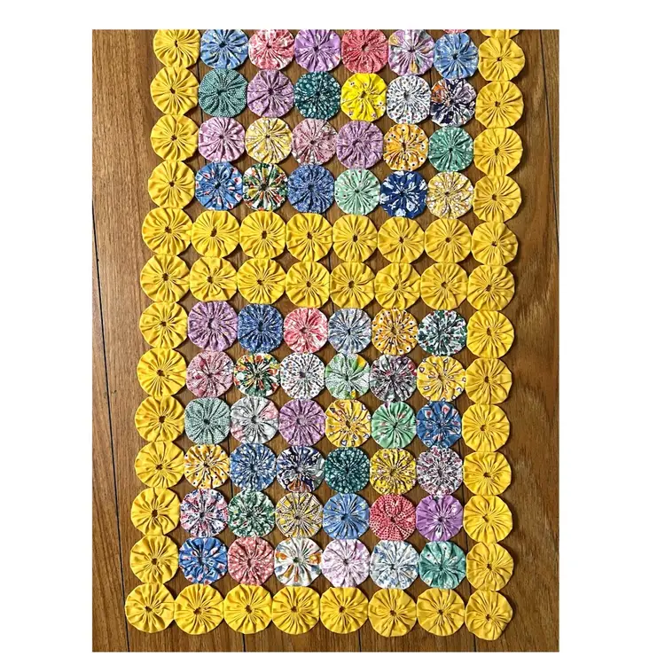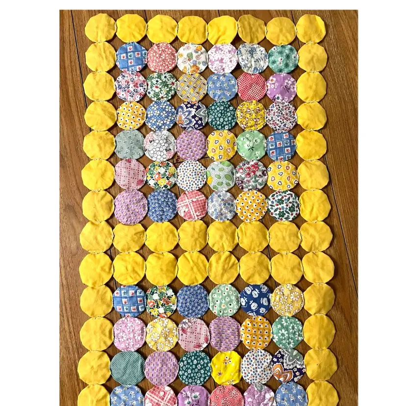 Yellow Yo-Yo Quilted Rectangle Fabric Table Runner Stitched Circular Pattern 15x30 in. Very good used condition