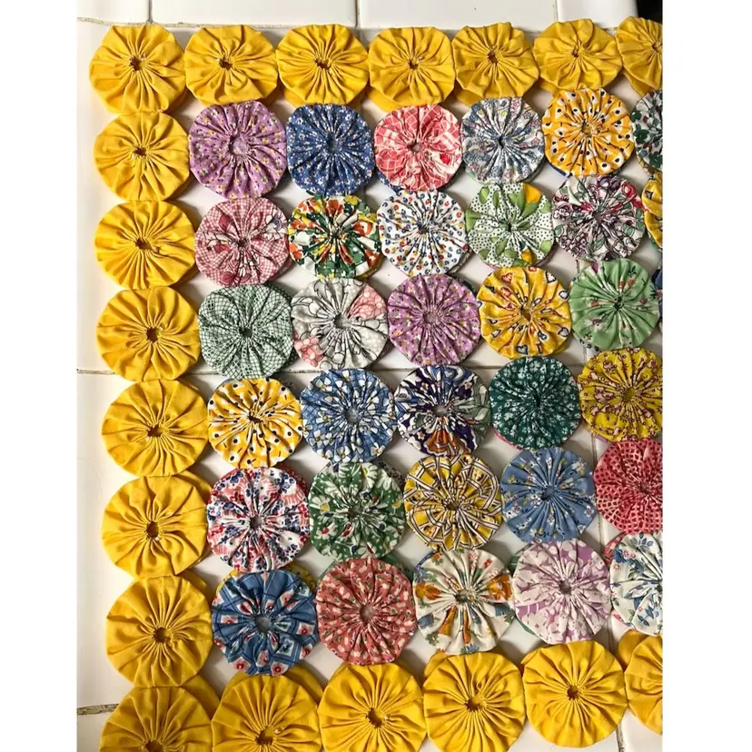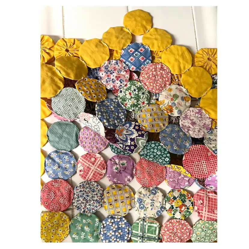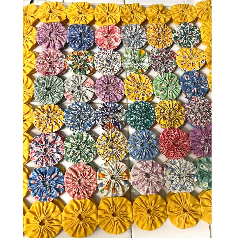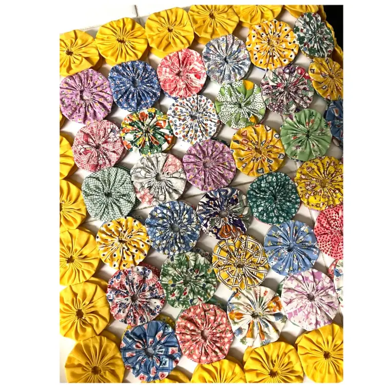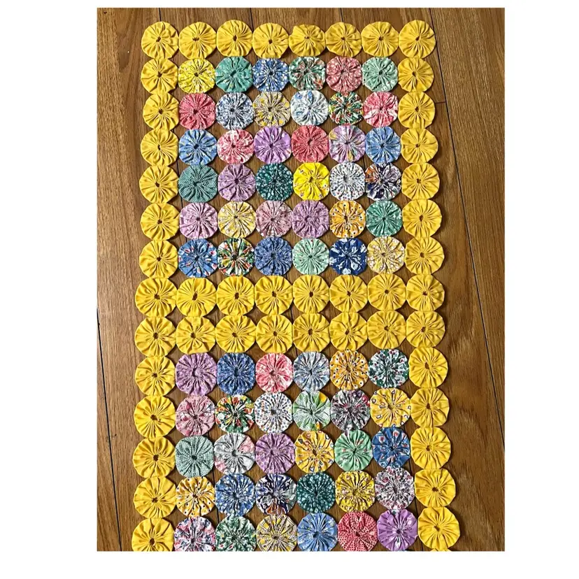 Yellow Yo-Yo Quilted Rectangle Fabric Table Runner Stitched Circular Pattern 15x30 in. Very good used condition