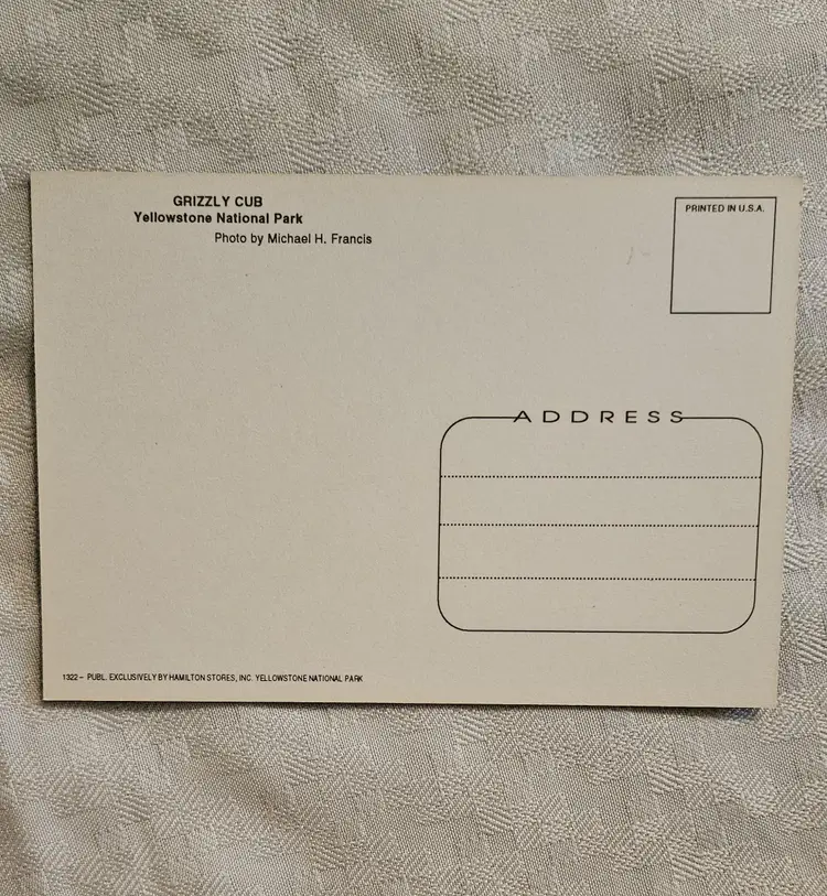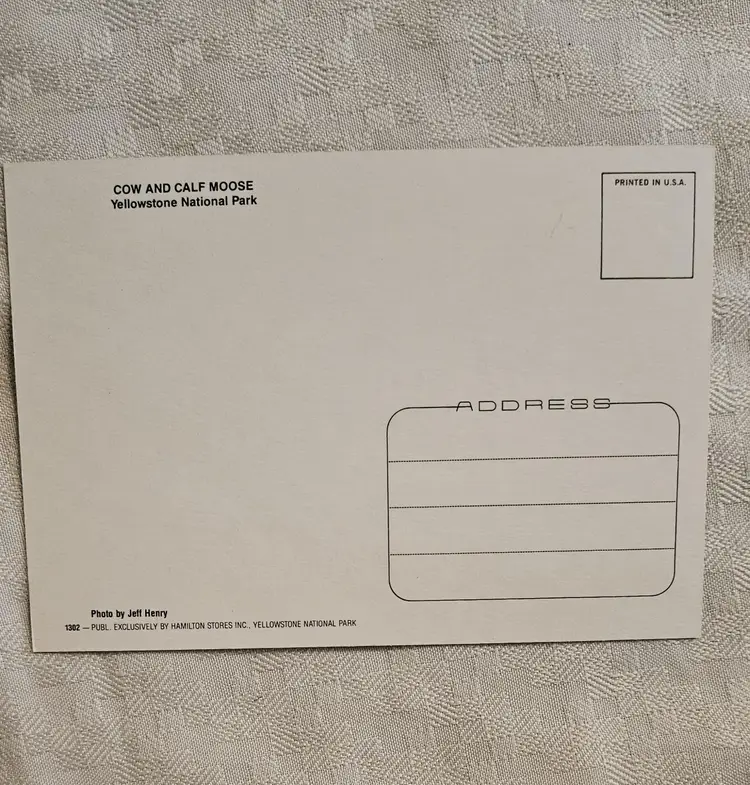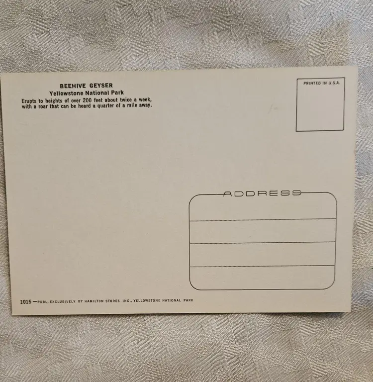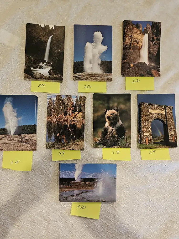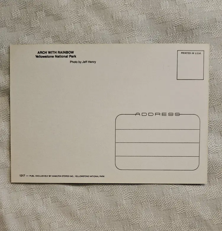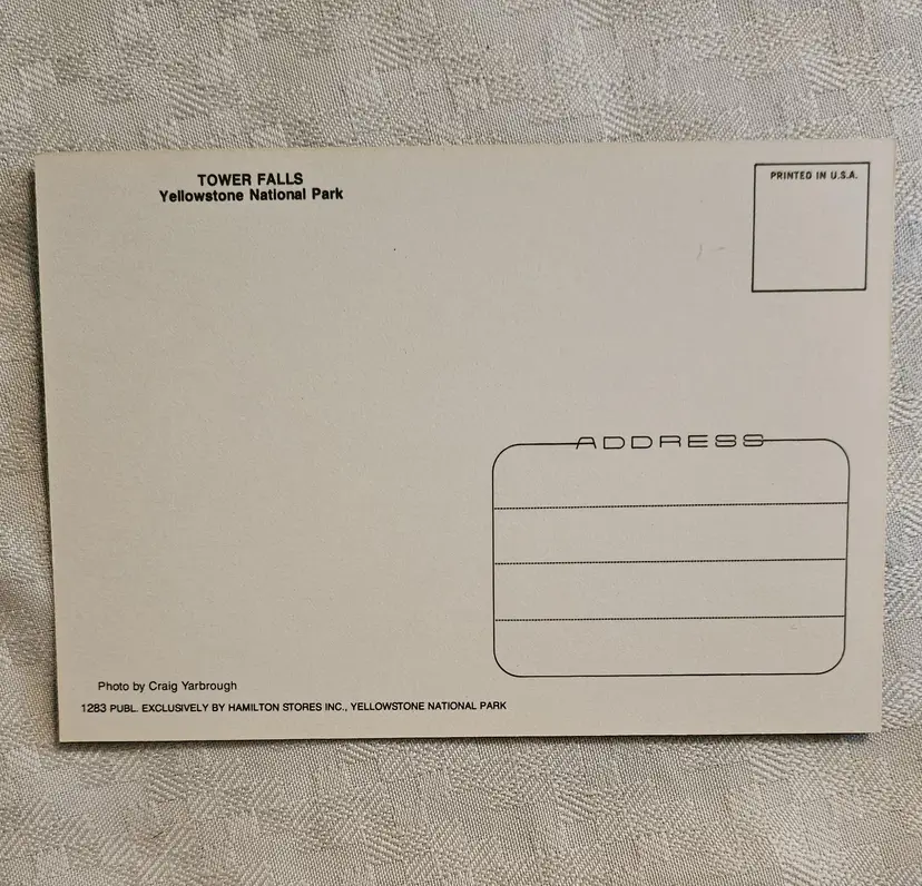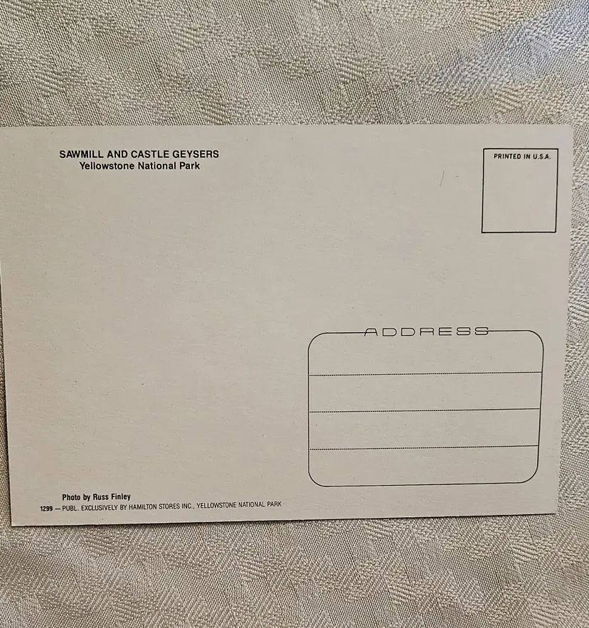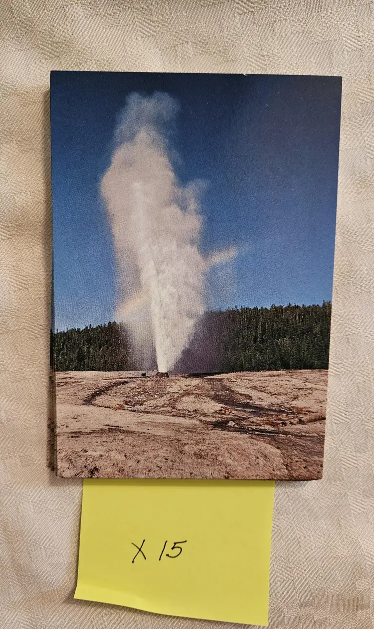 Sawmill and Castle Geysers X20 Tower Falls X20 Old Faithful Geyser X20 Tower Falls X20 Beehive Geyser X15 Grizzley Bear Cub X15 Gateway Arch X15 Moose with calf x9 Some of the cards were price marked on the back in pencil, that was later erased. Hamilton Stores was the concessioners in the park until 2002.