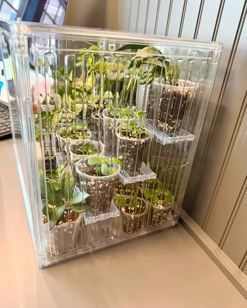 Clear Acrylic Box with magnetic door closure. Comes with 3 acrylic shelves that sit on built in wedges on the box sides. Shelves are removable to arrange plants based on size.
