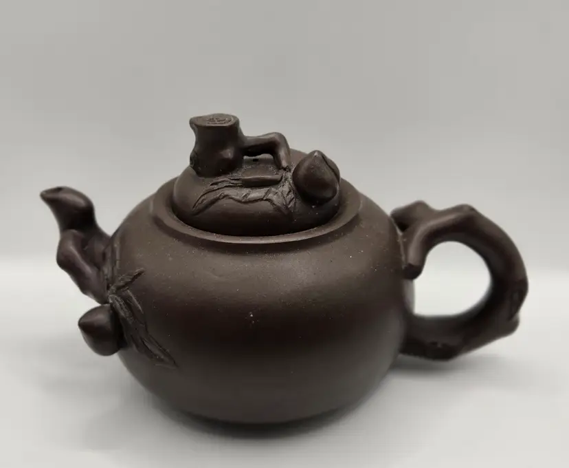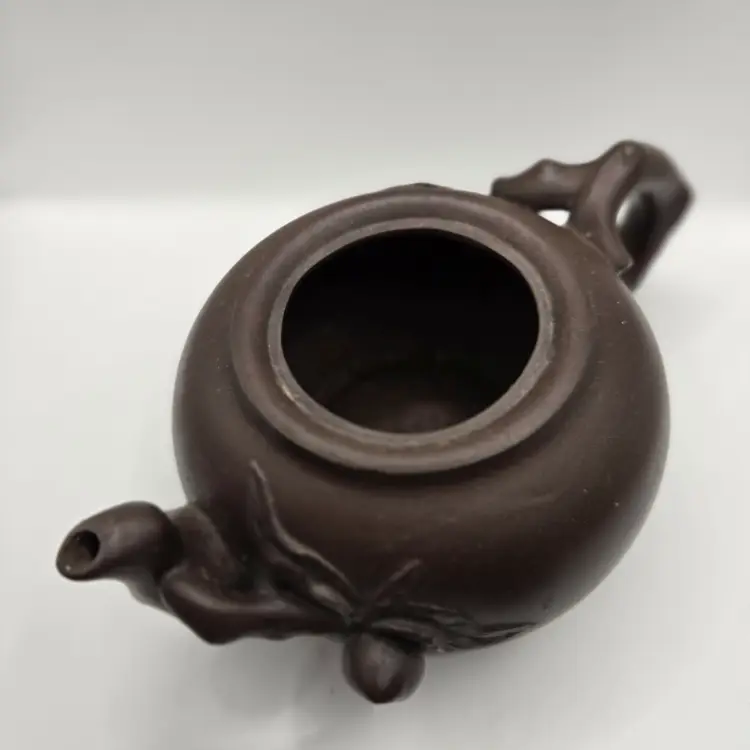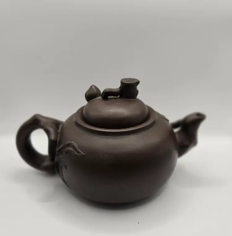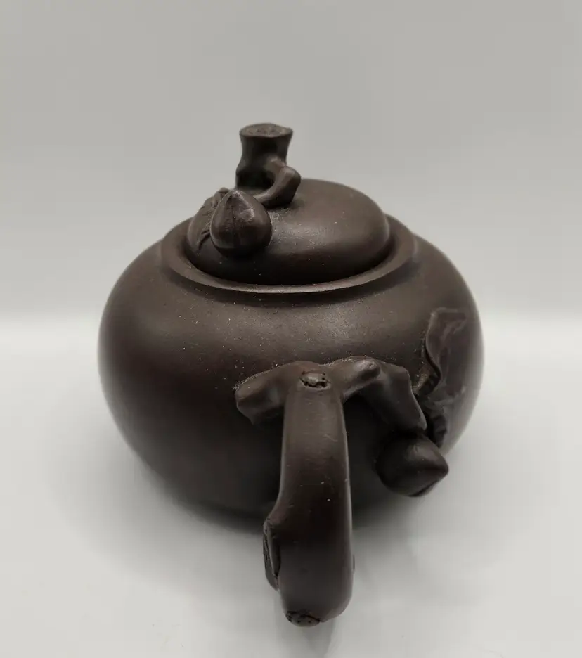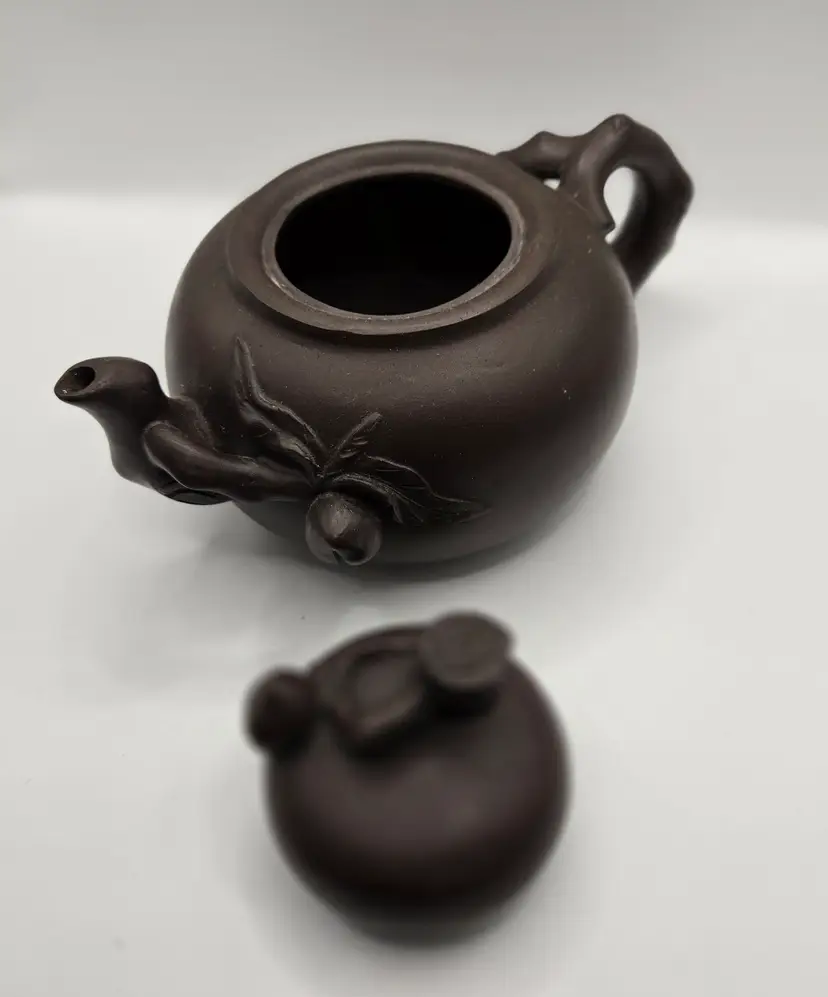 Yixing Vintage Dark Purple Clay Teapot with Branch and Bud design. 7" x 4.25" Good Vintage Condition. Has been used. Signed on bottom. Mark on bottom edge is original and is not a crack. No chips, cracks or crazing. Please see photos as they are part of the description. Item will be well wrapped before shipping. Items from my listings can be combined for shipping if safe to do so.