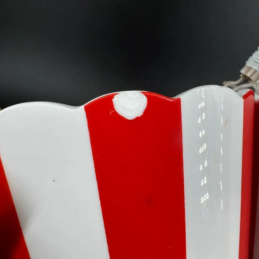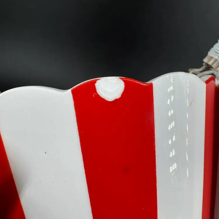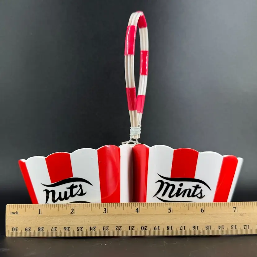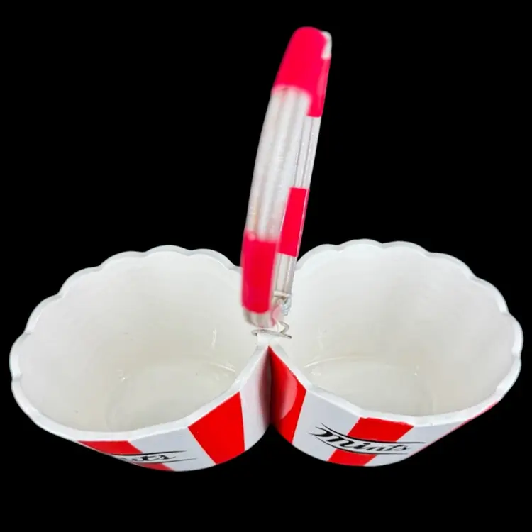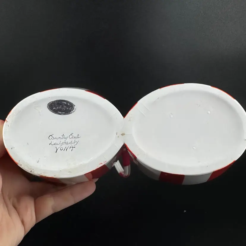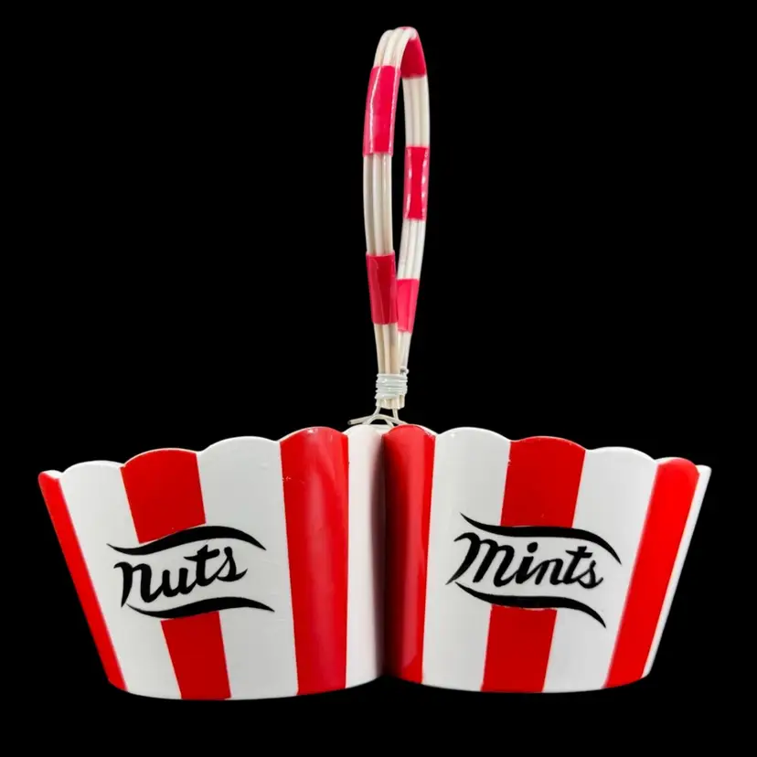 Divided serving bowl made of ceramic featuring a bowl for “nuts” and a bowl for “mints” and red/white stripes with ruffled edge, as well as a plastic cord handle secured on by wiring. There are a few chips towards the top of the bowl, as well as some crazing present in the glaze. Handwritten signature on bottom reading “Country Club designed by YONA”, as well as a sticker on bottom. Divided nuts and mints holder measures approximately 7” long and 2.5” tall not including handle.