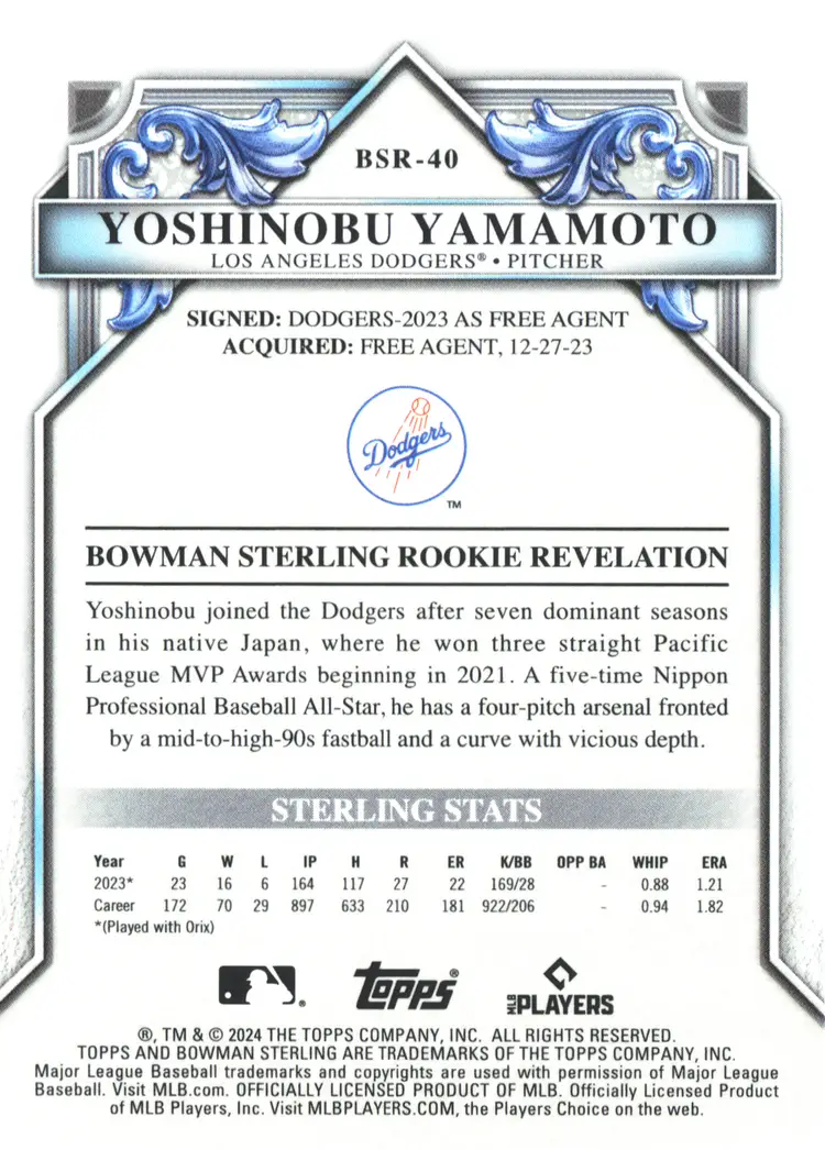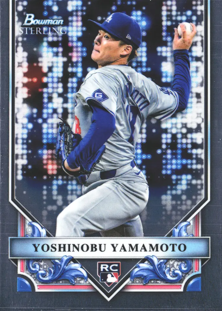 1st time buyer? Get $5 Off with code DISTRICT5 at checkout! Card as shown. All cards $20 and under ship PWE via lettertrackpro [https://www.letter-track.com/registerap.asp?AFID=8757] Sport: Baseball Set: 2024 Bowman Sterling Card Name: Yoshinobu Yamamoto - Los Angeles Dodgers Card Number: BSR-40 Player/Athlete: Yoshinobu Yamamoto Team: Los Angeles Dodgers