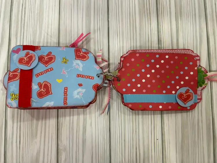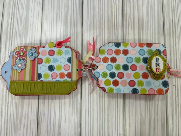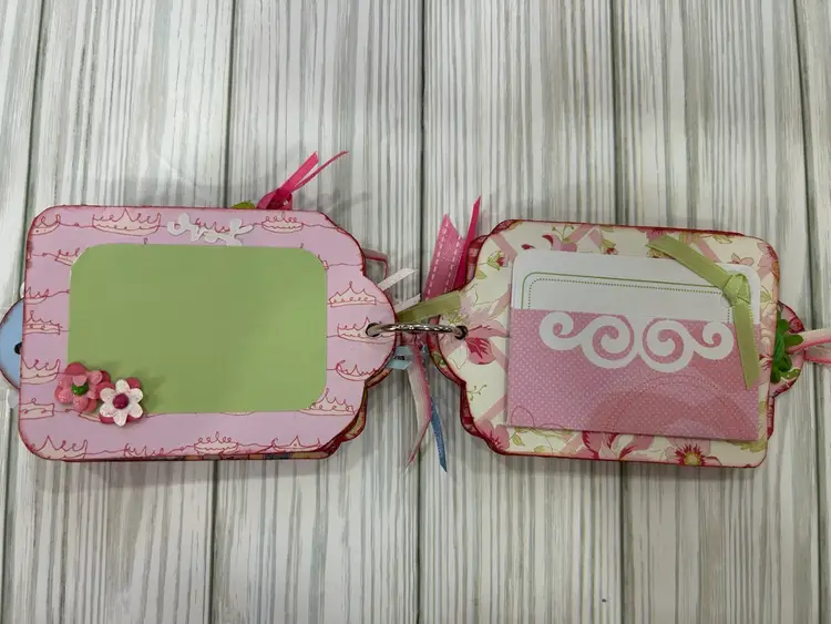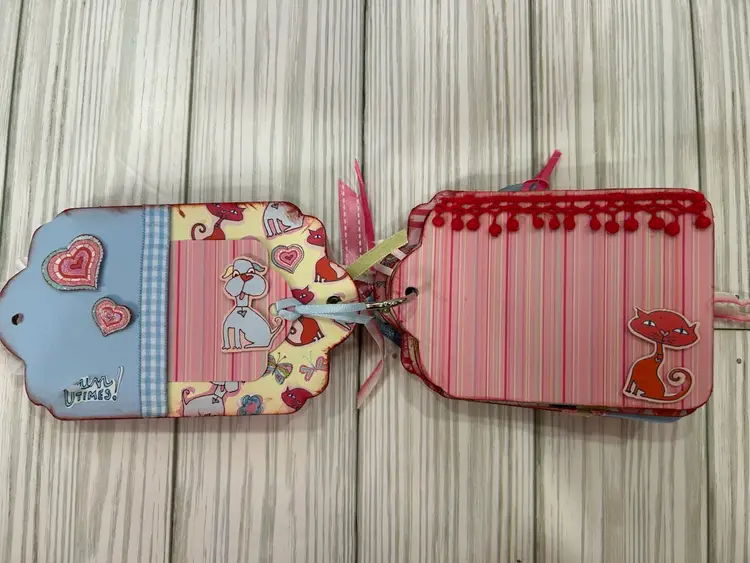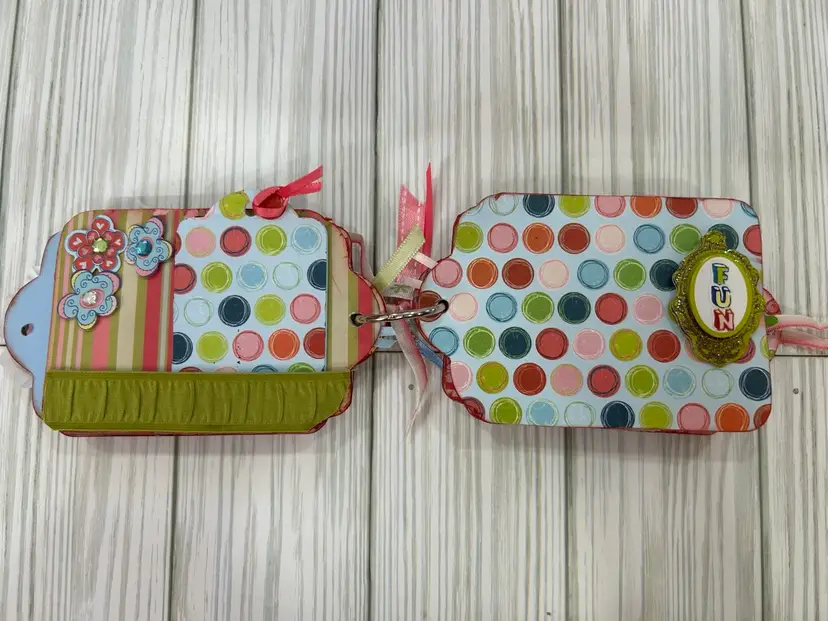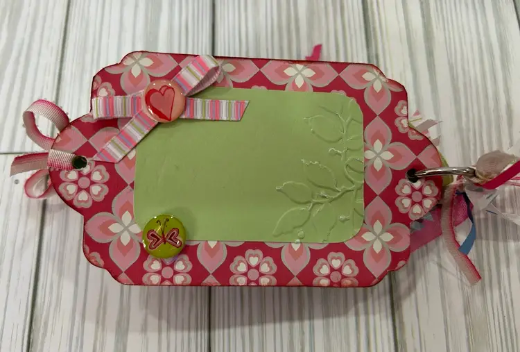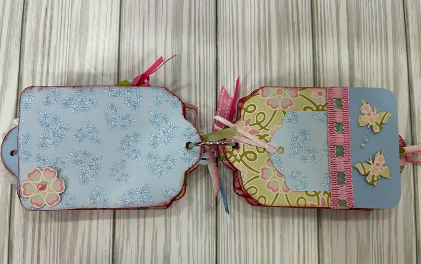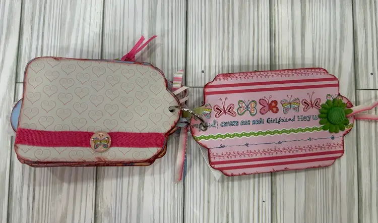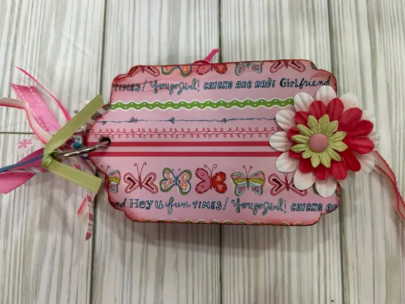 This precious little album/journal is 3” x 5” and is fully decorated including tags and pockets. She is adorned with lots of ribbons on her ring and would be enjoyed by a girl of any age!