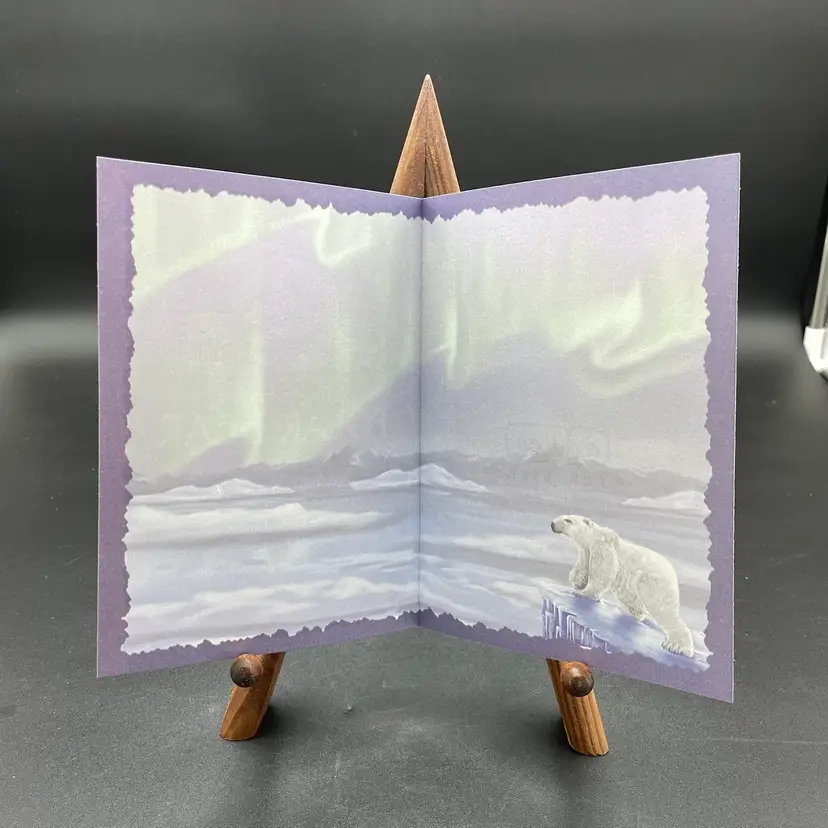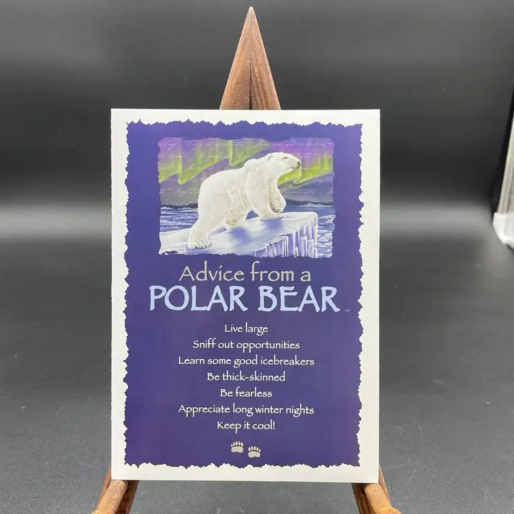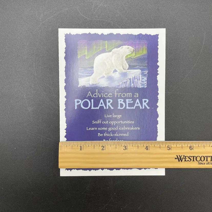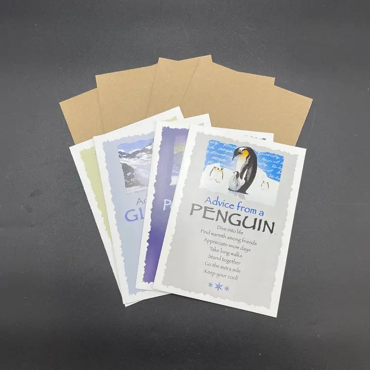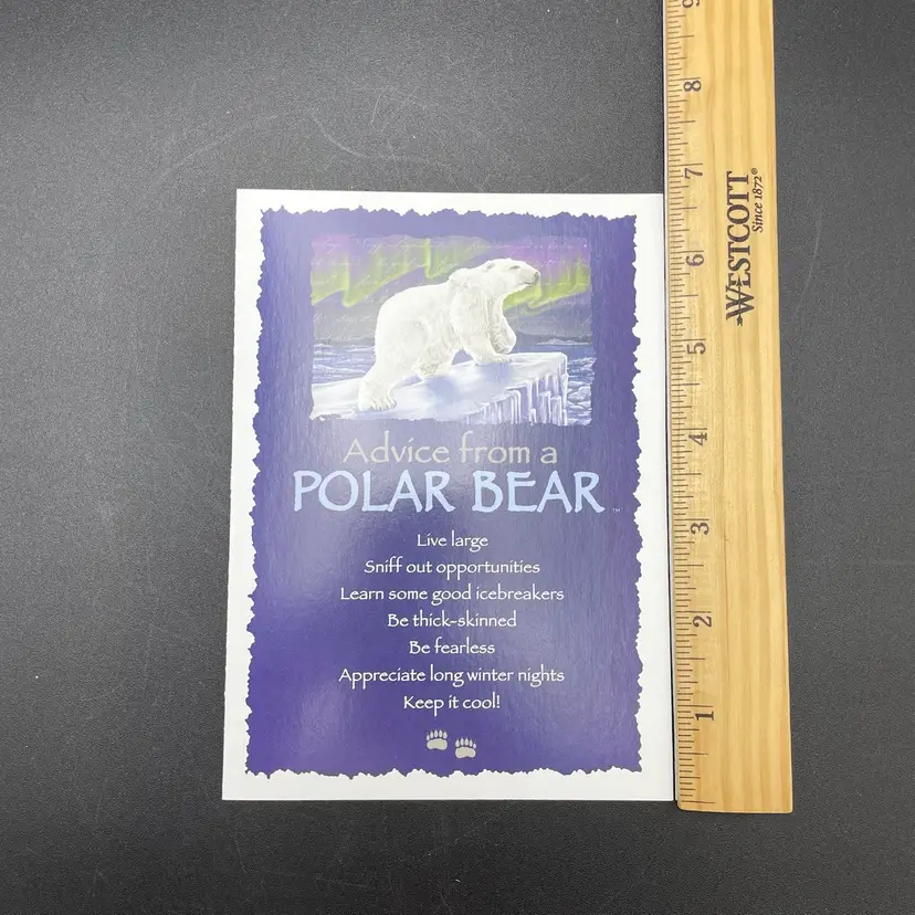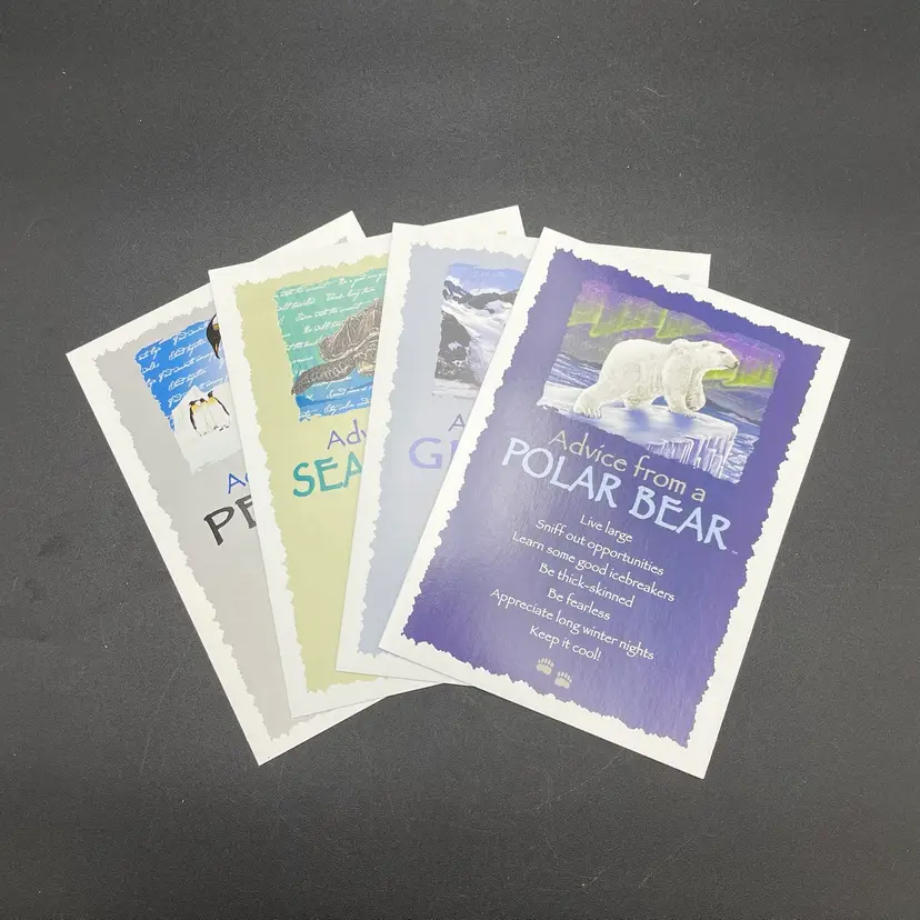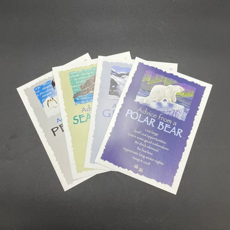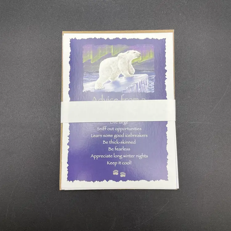 This is a set of 4 Your True Nature Advice from a Polar Bear blank notecards with envelopes. The set includes cards featuring a polar bear, a penguin, a sea turtle, and an ice glacier. The cards measure approximately 6.5" long x 4.5" wide. No box. No tears or creases.