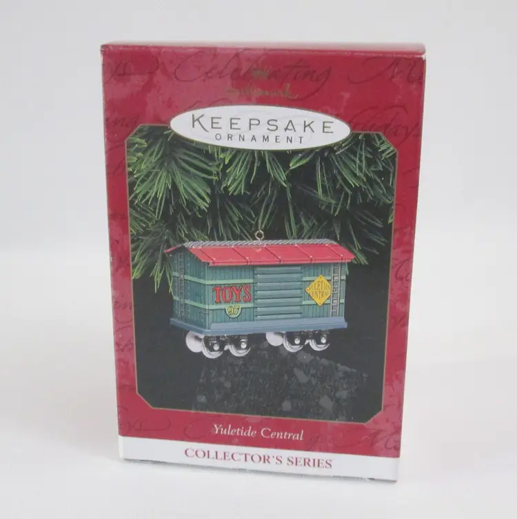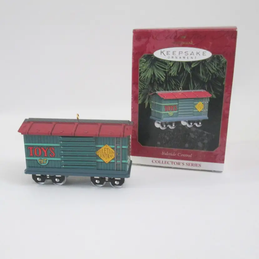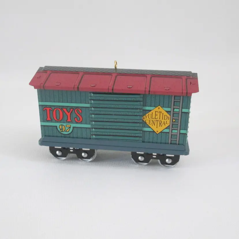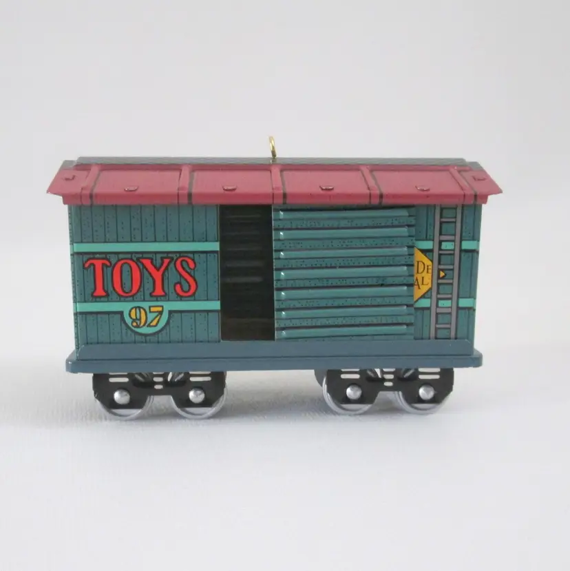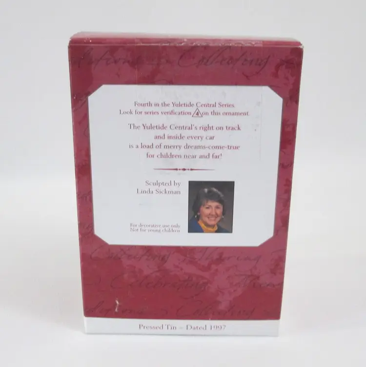 Yuletide Central Hallmark Keepsake ornament from 1997. Deisgned by Linda Sickman. Pressed tin toy baggage car, with sliding doors and wheels roll. With original bubble packaging and box with price tab. Box has clear tape on top and bottom.