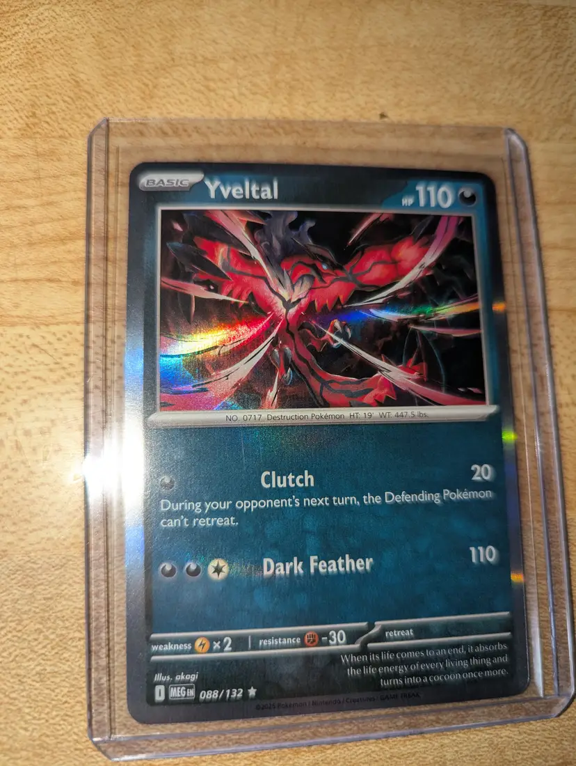 Shiny Yveltal card from the Pokémon series in a protective sleeve. Perfect for collectors and fans of the game.