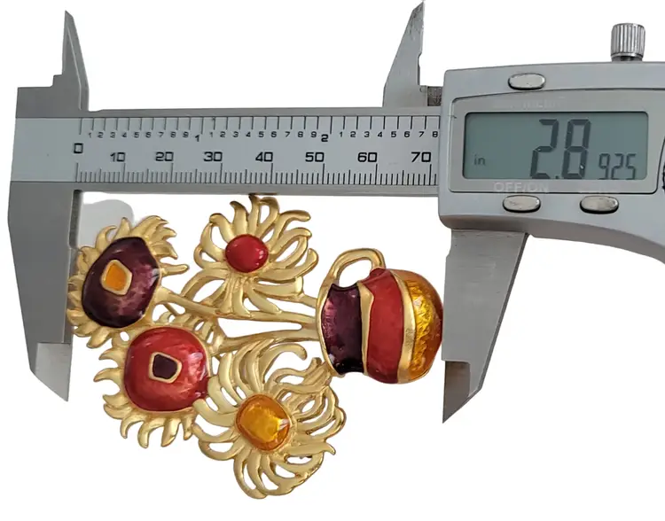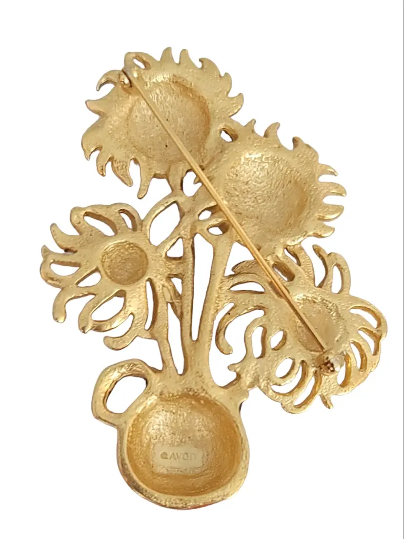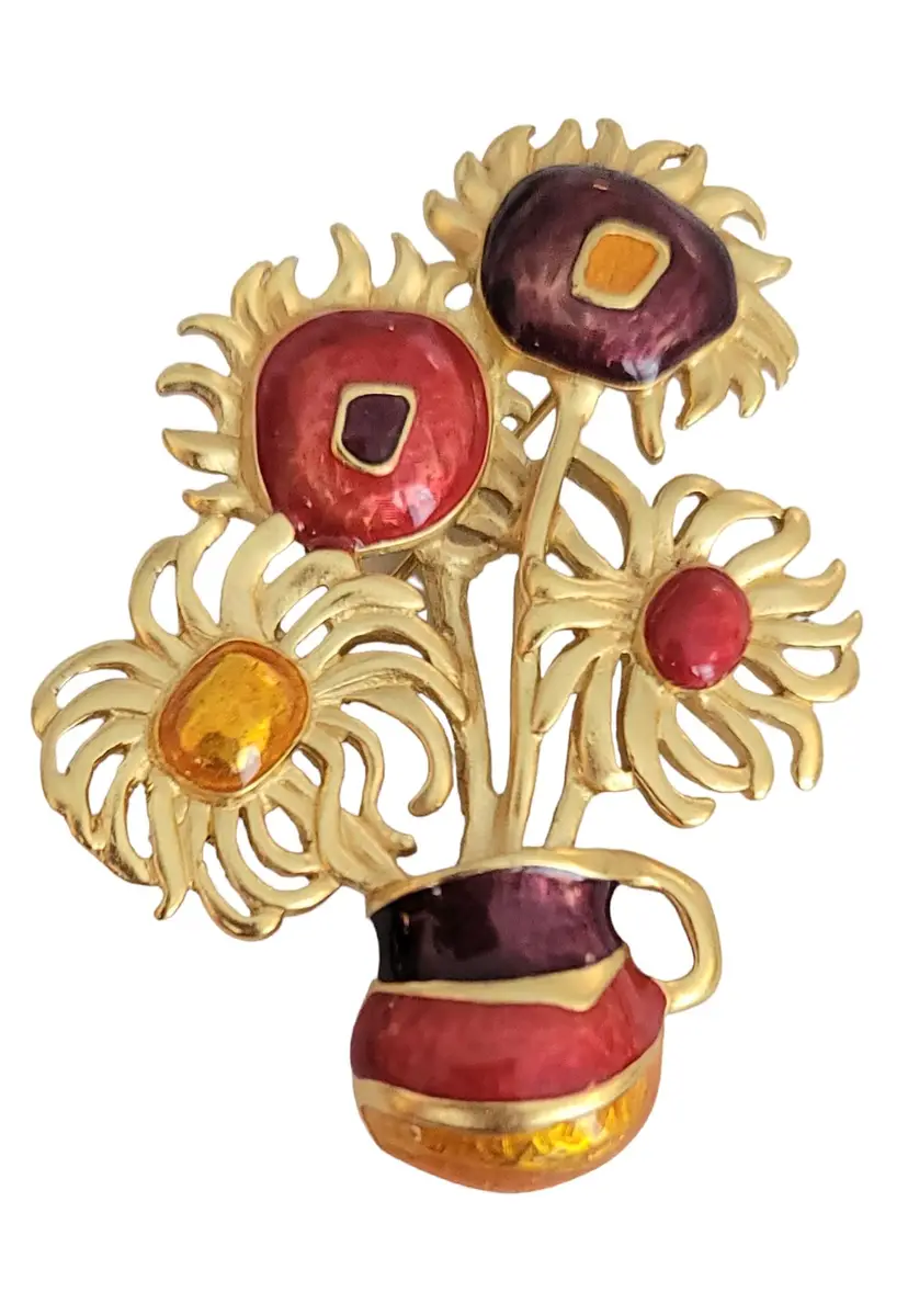 This pin is inspired by Van Gogh's "Vase Of Fifteen Sunflowers" Painting. Yves Saint Laurent created this brooch for AVON filled with color and cheerfulness reminiscent of the said painting. This hard-to-find piece features sunflowers in a jug in matte gold tone metal with yellow, red, and purple enamel. Marked ©AVON at the back. Measure approximately 2.1 inches in width and 2.8 inches in length. The pin mechanism works as designed and properly. This brooch is in good vintage condition.