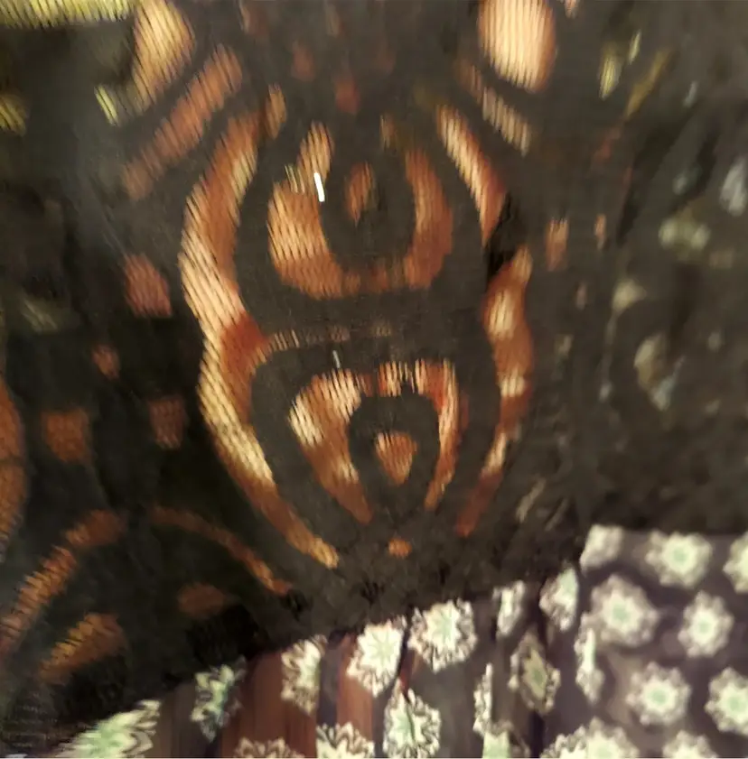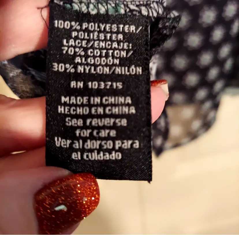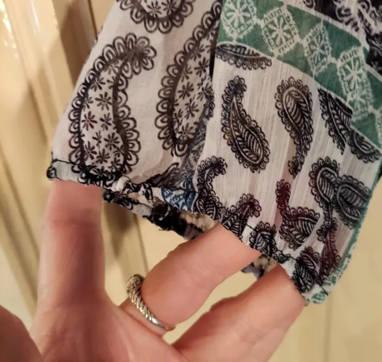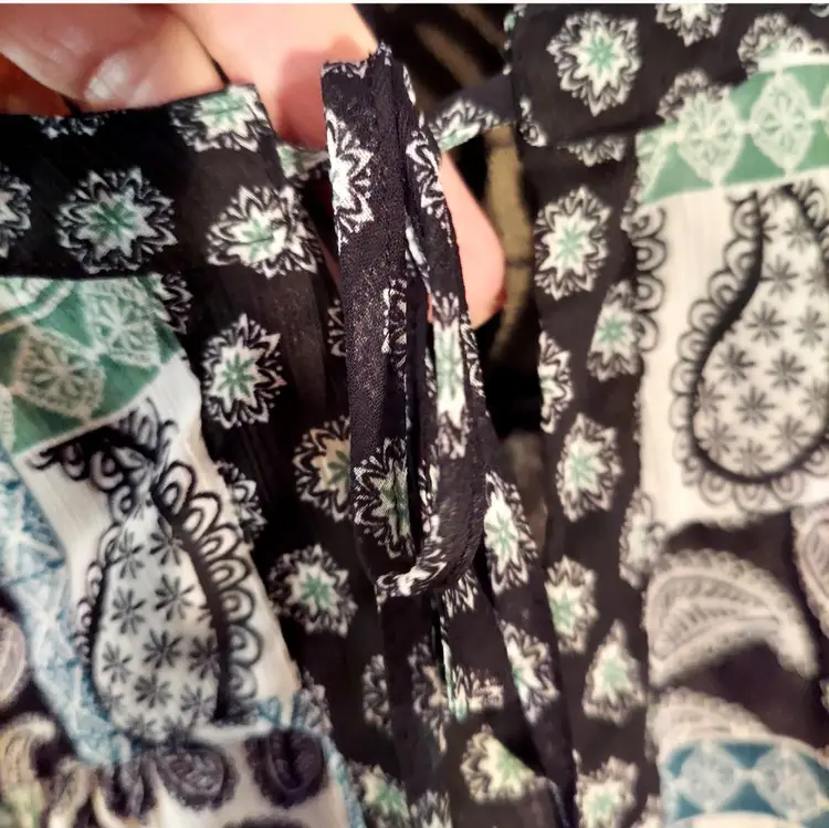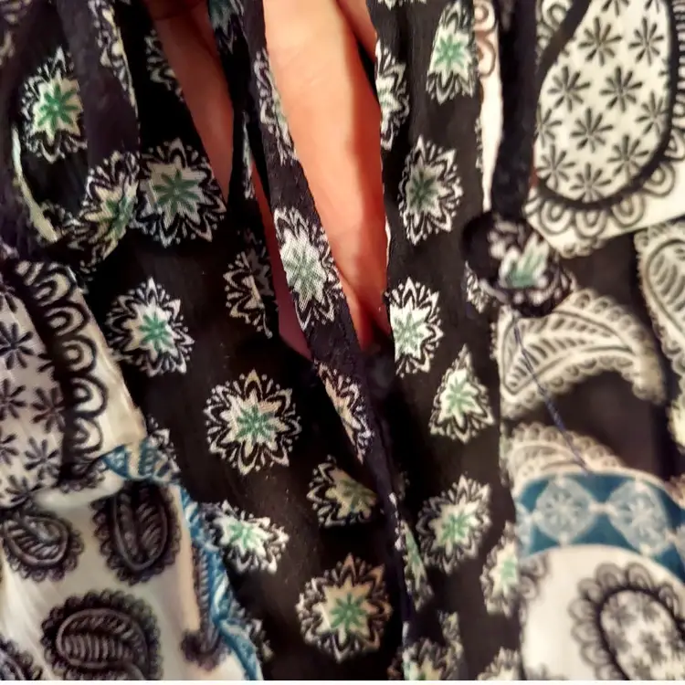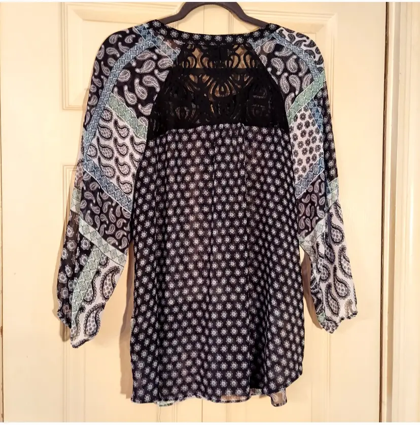 Beautiful green black gray paisley print top Ties at neck, lace in back Smoke free home Measures 29" long Measures 24" across under the arms