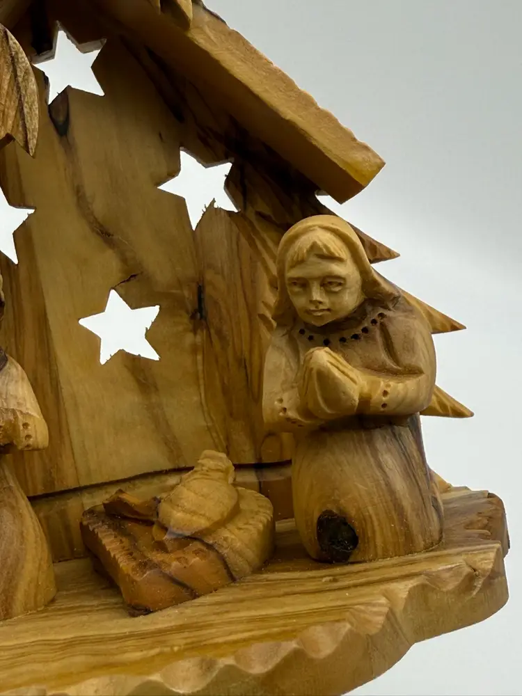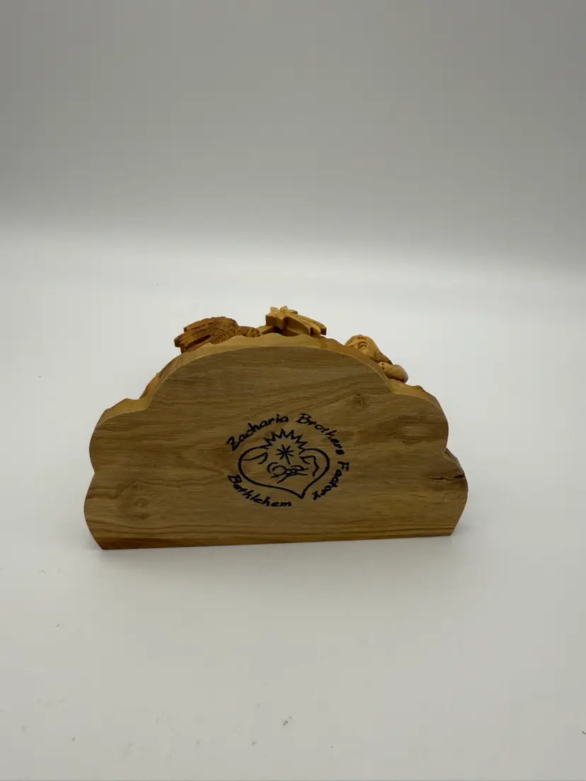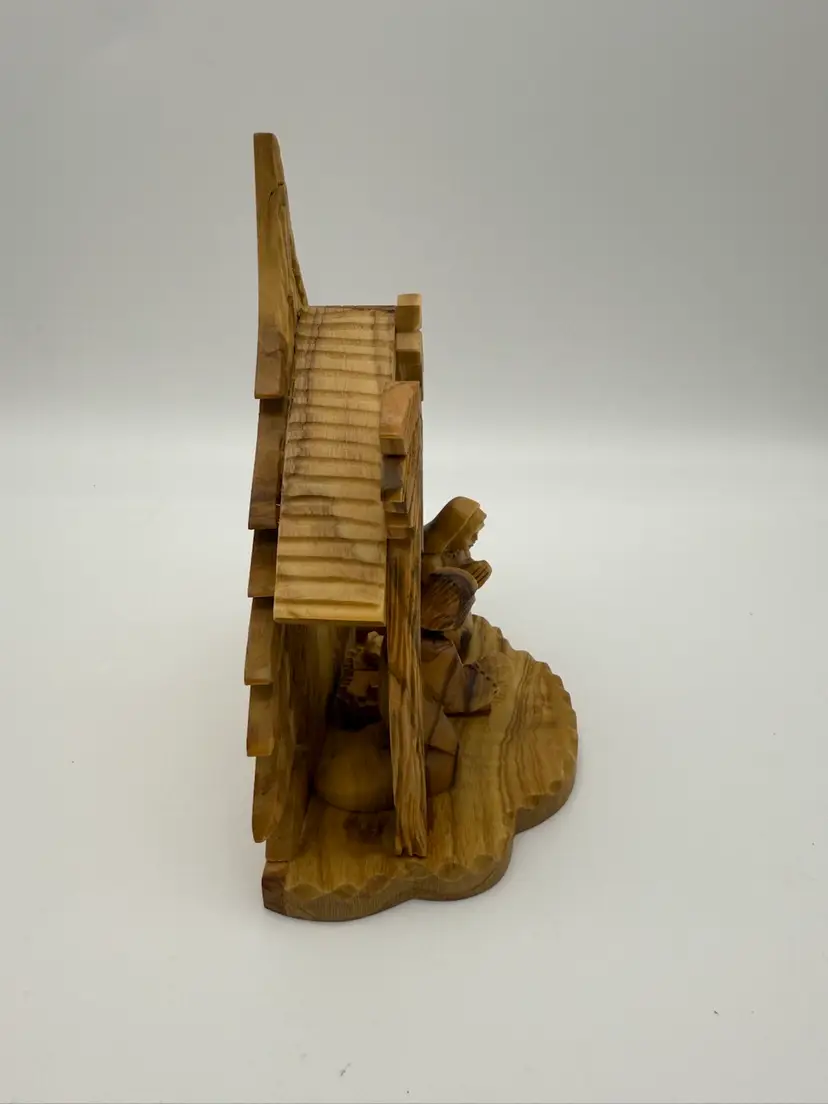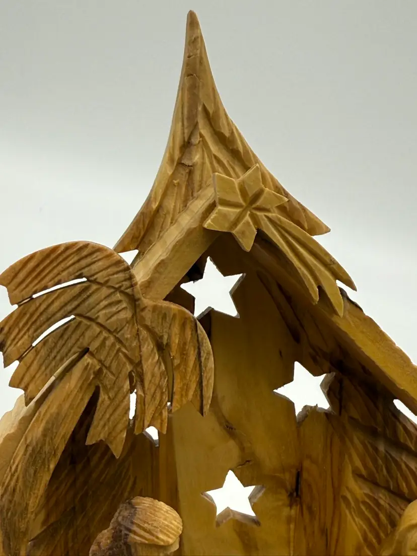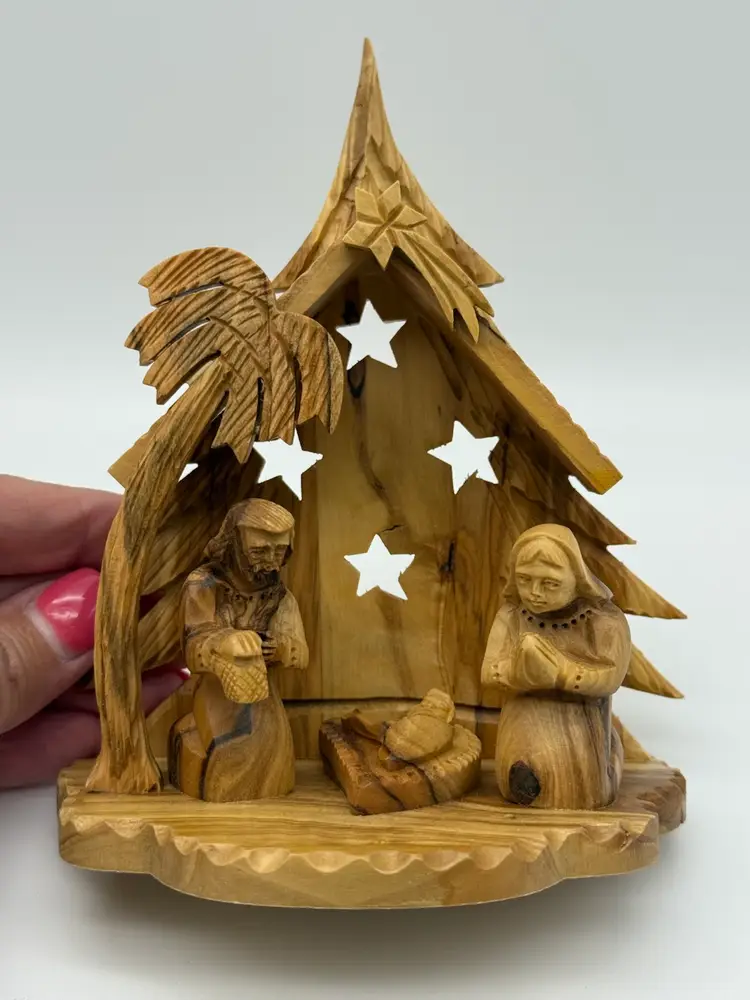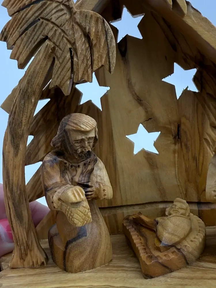 Beautiful ‘mini nativity crib’ scene from Zacharia Brothers. Handmade / hand carved in Bethlehem, Israel from olive wood. it features intricate carvings of the birth of Jesus. The nativity comes in its original box (box has tape and marker writing on outside). Please review all pictures - you can see the color variations of the wood, as well as areas where you can see the wood natural splits.