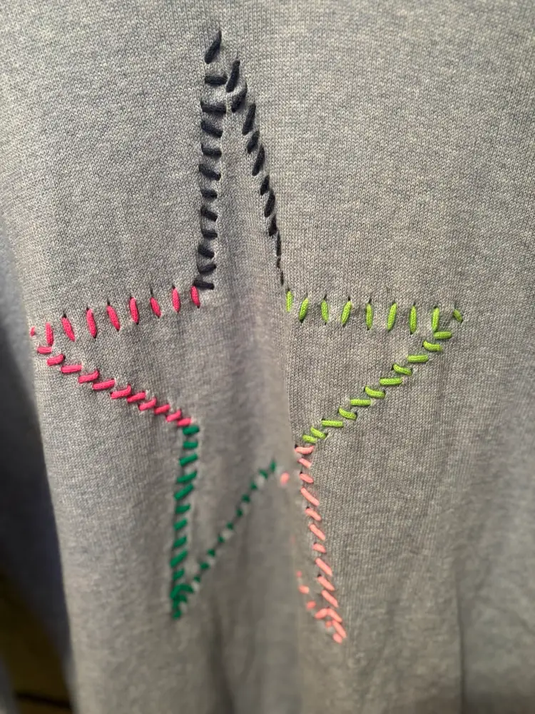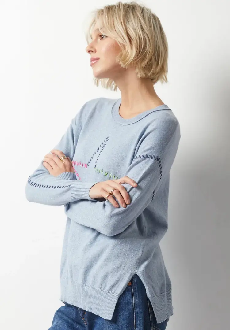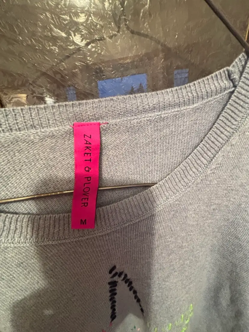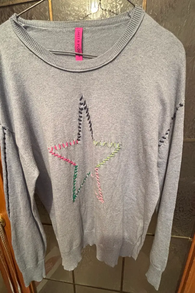 Cozy Zaket & Plover sweater in a lovely light blue! It features a cute star design with colourful stitching. No fabric tag. Best guess is cotton and wool. Retails for $165 CDN. 23” pit to pit.