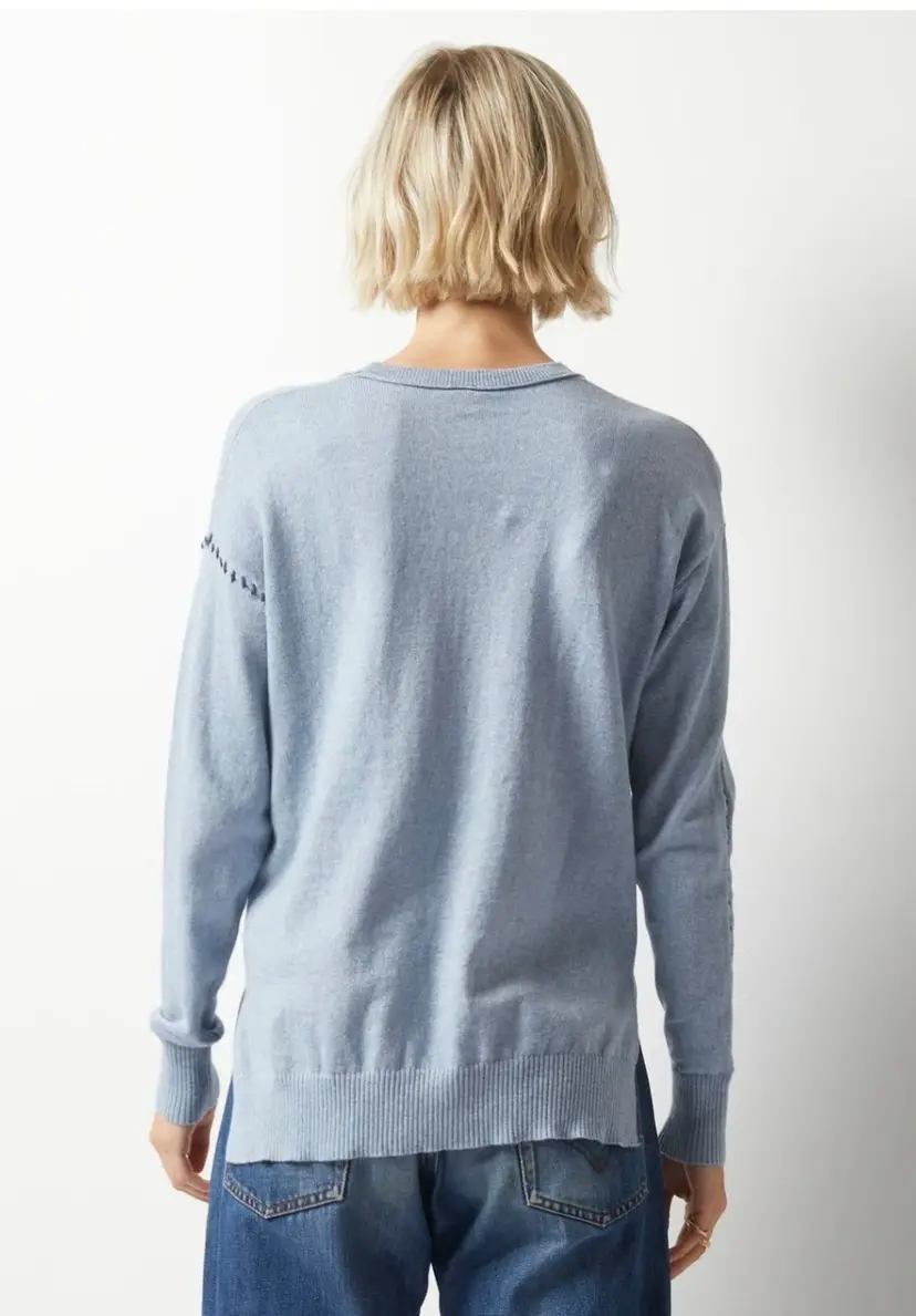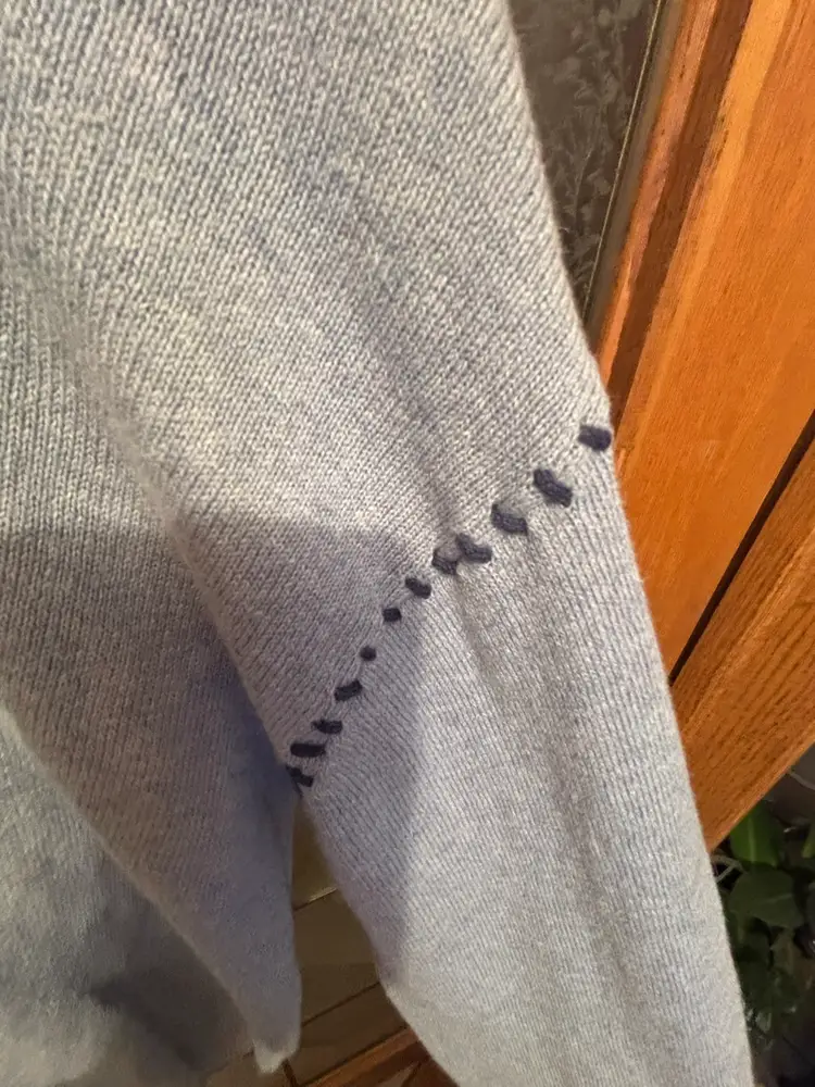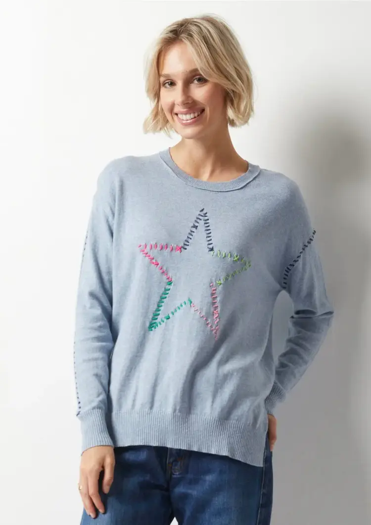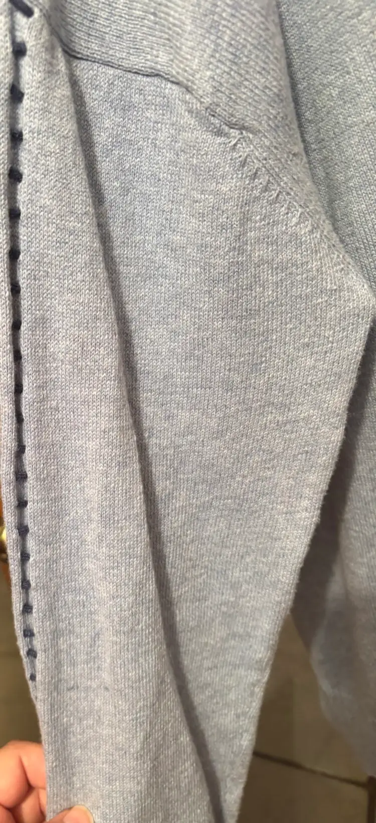 Cozy Zaket & Plover sweater in a lovely light blue! It features a cute star design with colourful stitching. No fabric tag. Best guess is cotton and wool. Retails for $165 CDN. 23” pit to pit.