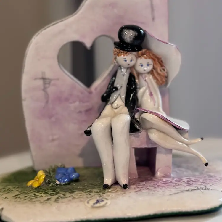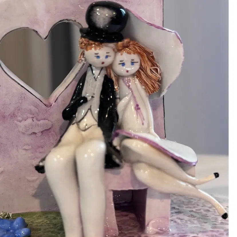 Vintage Italian porcelain handcrafted and hand-painted ceramic couple, by Leo Zampiva. Spaghetti hair details add a whimsical touch. Measures about 4 1/2 inches tall by 5 inches. Highly sought after by collectors of vintage Italian porcelain.