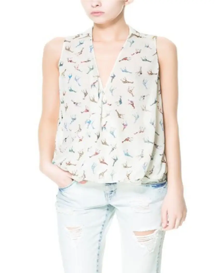 Sheer in the back and with a light lining in the front. Cross V neck. Zara Giraffe Print Cream Sleeveless Top gauze-y like material Cream with rainbow giraffes semi sheer V neck faux wrap