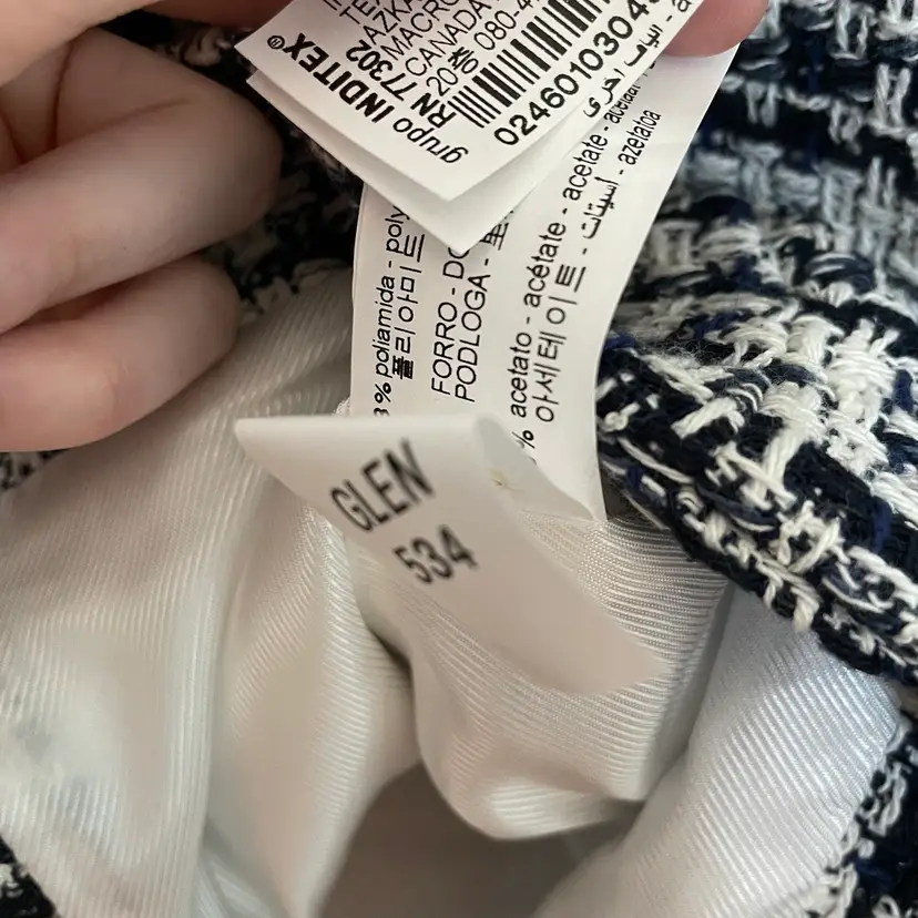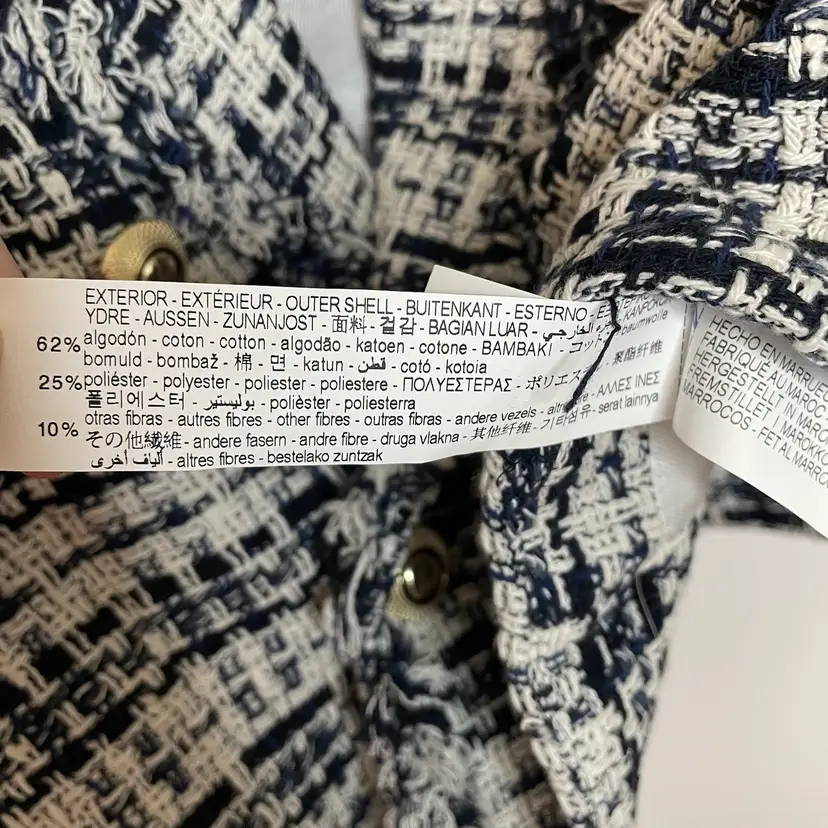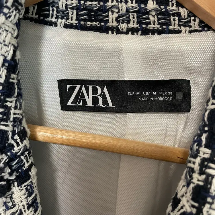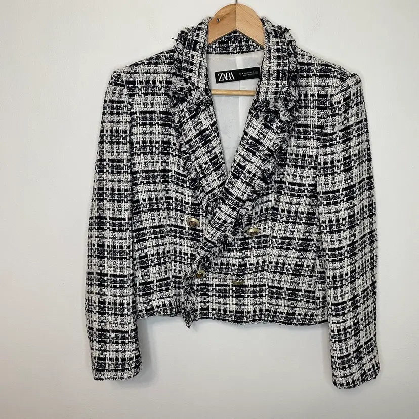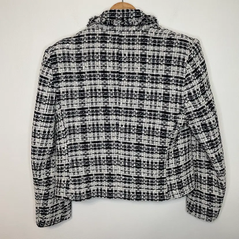 Zara Womens Black and White Plaid Checkered Textured Tweed Boucle Double Breasted Fringe Blazer Jacket No Flaws of Note Cotton Blend Exterior Size M Approx. Measurements: Pit to Pit: 21 Inches Length: 21 Inches