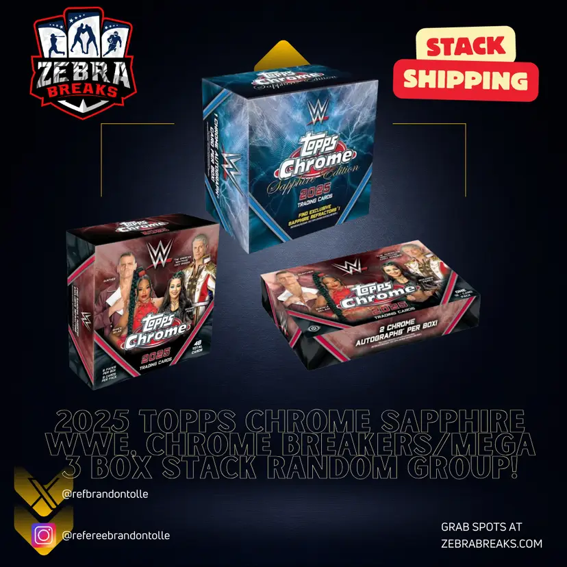 1 - 2025 Chrome Sapphire WWE Hobby 1 - 2025 Chrome Breakers WWE 1 - 2025 Chrome Mega WWE Each Spot contains 8-9 Talent. You will receive ALL cards of the talent in your spot! STACK SHIPPING APPLIES All cards stack, you can request shipping by purchasing the "Stack Shipping Request" Item in the marketplace for Zebra Breaks specifically. Stack shipping is a $5 flat fee no matter how large your stack is. Shipping will occur the Friday/Saturday following your request if placed by Thursday night of the week you request shipping