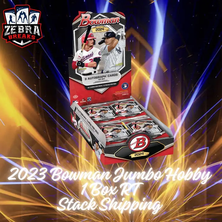 1 Jumbo Box of 2024 Bowman Baseball! STACK SHIPPING APPLIES All cards stack, you can request shipping by purchasing the "Stack Shipping Request" Item in the marketplace for Zebra Breaks specifically. Stack shipping is a $5 flat fee no matter how large your stack is. Shipping will occur the Friday/Saturday following your request if placed by Thursday night of the week you request shipping.