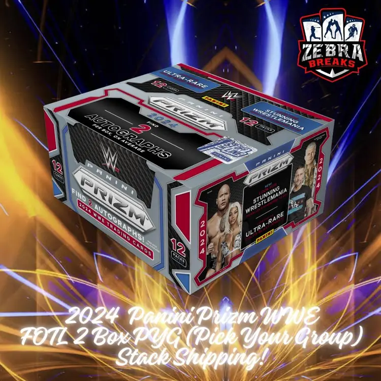 2 Hobby Boxes of 2024 Panini Prizm WWE! 4 Autographs & FOTL PARALLELS!! ALL CARDS SHIP! Each Spot contains 10-11 Talent. You get ALL Cards of the Talent in the spot you choose. STACK SHIPPING APPLIES All cards stack, you can request shipping by purchasing the "Stack Shipping Request" Item in the marketplace for Zebra Breaks specifically. Stack shipping is a $5 flat fee no matter how large your stack is. Shipping will occur the Friday/Saturday following your request if placed by Thursday night of the week you request shipping.