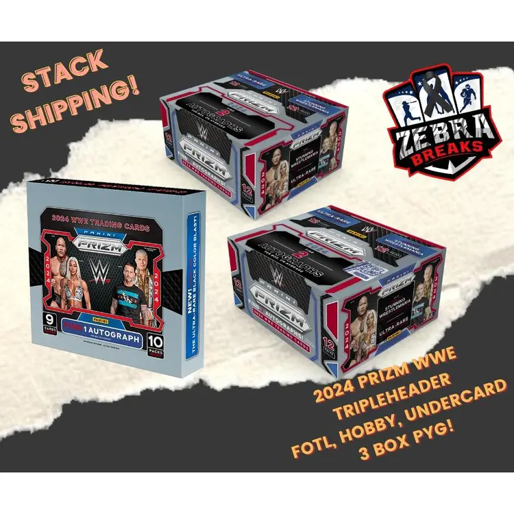 The 2024 Prizm WWE Tripleheader!! 1 Box - 2024 Prizm WWE FOTL 1 Box - 2024 Prizm WWE Hobby 1 Box - 2024 Prizm WWE Undercard 5 Autographs, BOTH Colorblast Variations are possible. 1 Image Variation, Throwback Hobby & Disco Autos Possible & MORE! STACK SHIPPING APPLIES All cards stack, you can request shipping by purchasing the "Stack Shipping Request" Item in the marketplace for Zebra Breaks specifically. Stack shipping is a $5 flat fee no matter how large your stack is. Shipping will occur the Friday/Saturday following your request if placed by Thursday night of the week you request shipping.