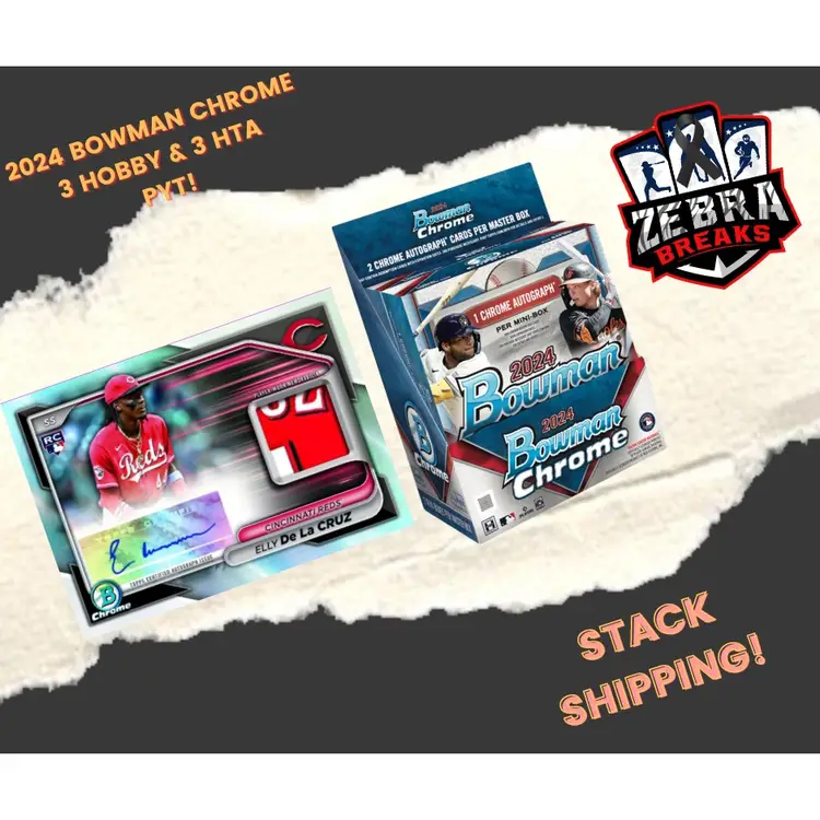 3 Hobby Boxes of 2024 Bowman Chrome 3 HTA Boxes of 2024 Bowman Chrome STACK SHIPPING APPLIES All cards stack, you can request shipping by purchasing the "Stack Shipping Request" Item in the marketplace for Zebra Breaks specifically. Stack shipping is a $5 flat fee no matter how large your stack is. Shipping will occur the Friday/Saturday following your request if placed by Thursday night of the week you request shipping.