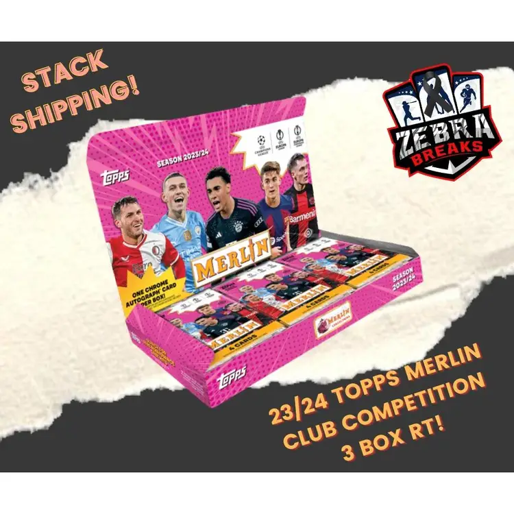 3 Hobby Boxes of 23/24 Topps Merlin Club Competition Soccer! 3 Autos & More!! STACK SHIPPING APPLIES All cards stack, you can request shipping by purchasing the "Stack Shipping Request" Item in the marketplace for Zebra Breaks specifically. Stack shipping is a $5 flat fee no matter how large your stack is. Shipping will occur the Friday/Saturday following your request if placed by Thursday night of the week you request shipping.