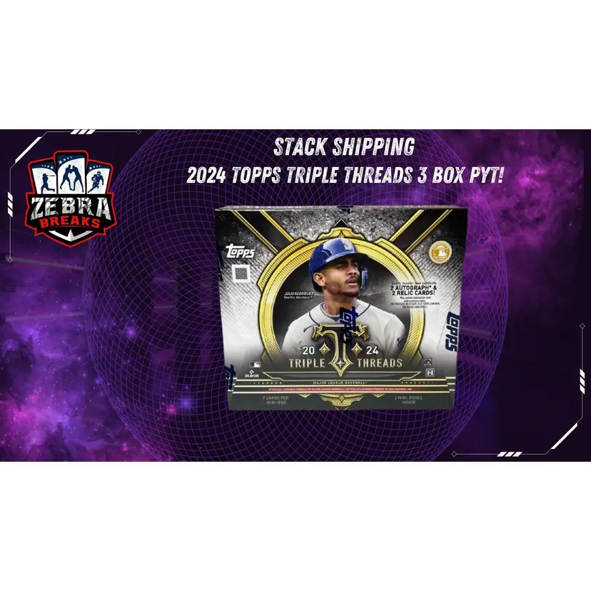 3 Boxes of 2024 Topps Triple Threads STACK SHIPPING APPLIES All cards stack, you can request shipping by purchasing the "Stack Shipping Request" Item in the marketplace for Zebra Breaks specifically. Stack shipping is a $5 flat fee no matter how large your stack is. Shipping will occur the Friday/Saturday following your request if placed by Thursday night of the week you request shipping.