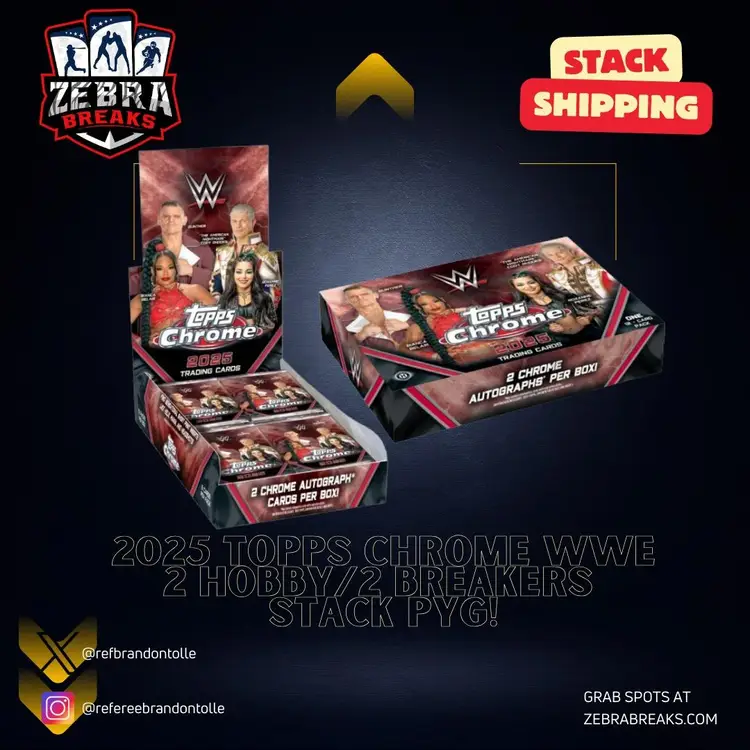 2 Hobby & 2 Breakers Delight of 2025 Topps Chrome WWE STACK SHIPPING APPLIES All cards stack, you can request shipping by purchasing the "Stack Shipping Request" Item in the marketplace for Zebra Breaks specifically. Stack shipping is a $5 flat fee no matter how large your stack is. Shipping will occur the Friday/Saturday following your request if placed by Thursday night of the week you request shipping.