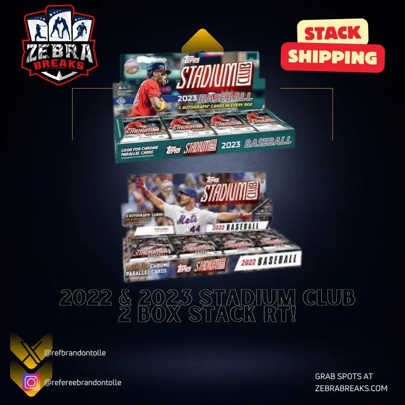 1 EACH of 2022 & 2023 Stadium Club Hobby STACK SHIPPING APPLIES All cards stack, you can request shipping by purchasing the "Stack Shipping Request" Item in the marketplace for Zebra Breaks specifically. Stack shipping is a $5 flat fee no matter how large your stack is. Shipping will occur the Friday/Saturday following your request if placed by Thursday night of the week you request shipping