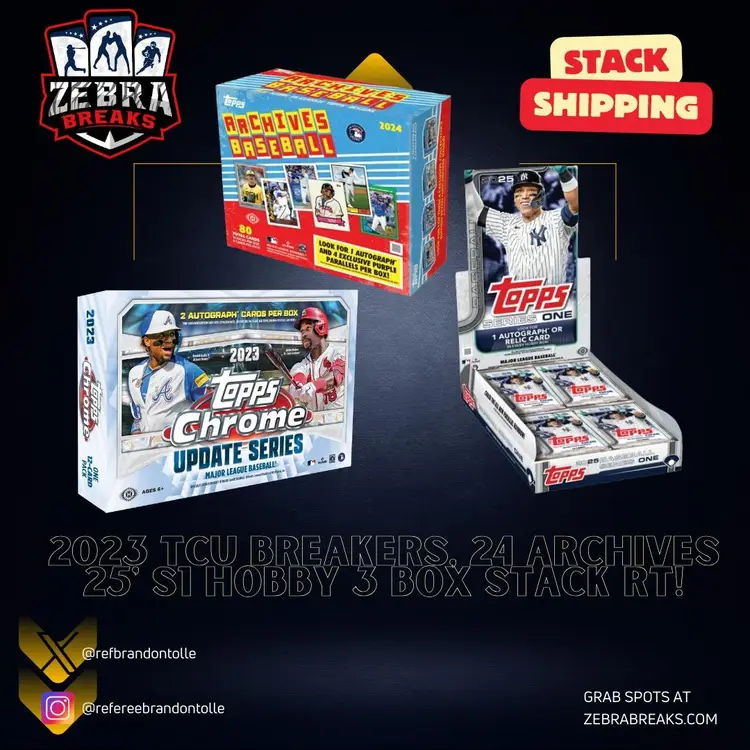 23 TCU Breakers/24 Archives Collectors/25 Topps Series 1 Hobby STACK SHIPPING APPLIES All cards stack, you can request shipping by purchasing the "Stack Shipping Request" Item in the marketplace for Zebra Breaks specifically. Stack shipping is a $5 flat fee no matter how large your stack is. Shipping will occur the Friday/Saturday following your request if placed by Thursday night of the week you request shipping