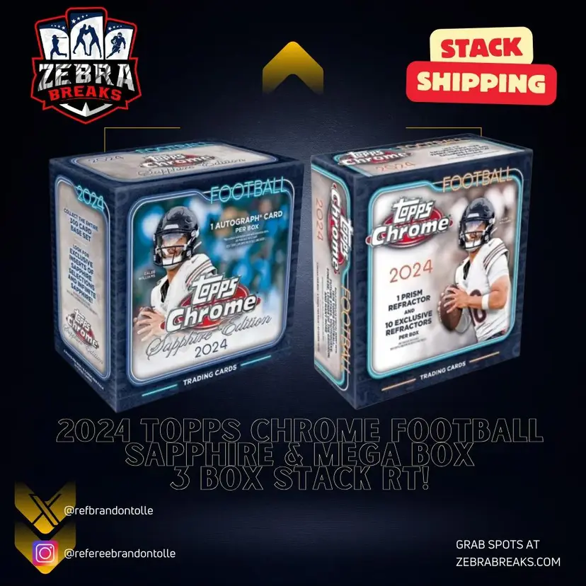 2 - 2024 Topps Chrome Football Mega Boxes 1 - 2024 Topps Chrome Football Sapphire STACK SHIPPING APPLIES STACK SHIPPING APPLIES All cards stack, you can request shipping by purchasing the "Stack Shipping Request" Item in the marketplace for Zebra Breaks specifically. Stack shipping is a $5 flat fee no matter how large your stack is. Shipping will occur the Friday/Saturday following your request if placed by Thursday night of the week you request shipping