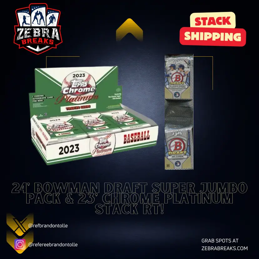 1x 24 Bowman Draft Super Jumbo Pack/23 Topps Chrome Platinum Anniversary STACK SHIPPING APPLIES All cards stack, you can request shipping by purchasing the "Stack Shipping Request" Item in the marketplace for Zebra Breaks specifically. Stack shipping is a $5 flat fee no matter how large your stack is. Shipping will occur the Friday/Saturday following your request if placed by Thursday night of the week you request shipping